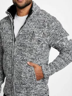 A marled design makes up this wool-blend sweater featuring a mock neckline with sherpa lining, long sleeves, front pockets, ribbed trim and a zip-up closure.