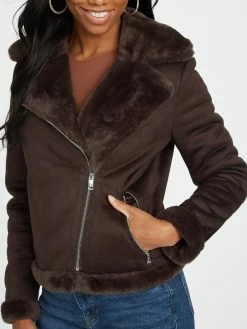 A cold-weather essential, this moto-style jacket features faux-shearling trim throughout, a classic notched folded collar, an asymmetrical zip-up closure and side zip pockets.