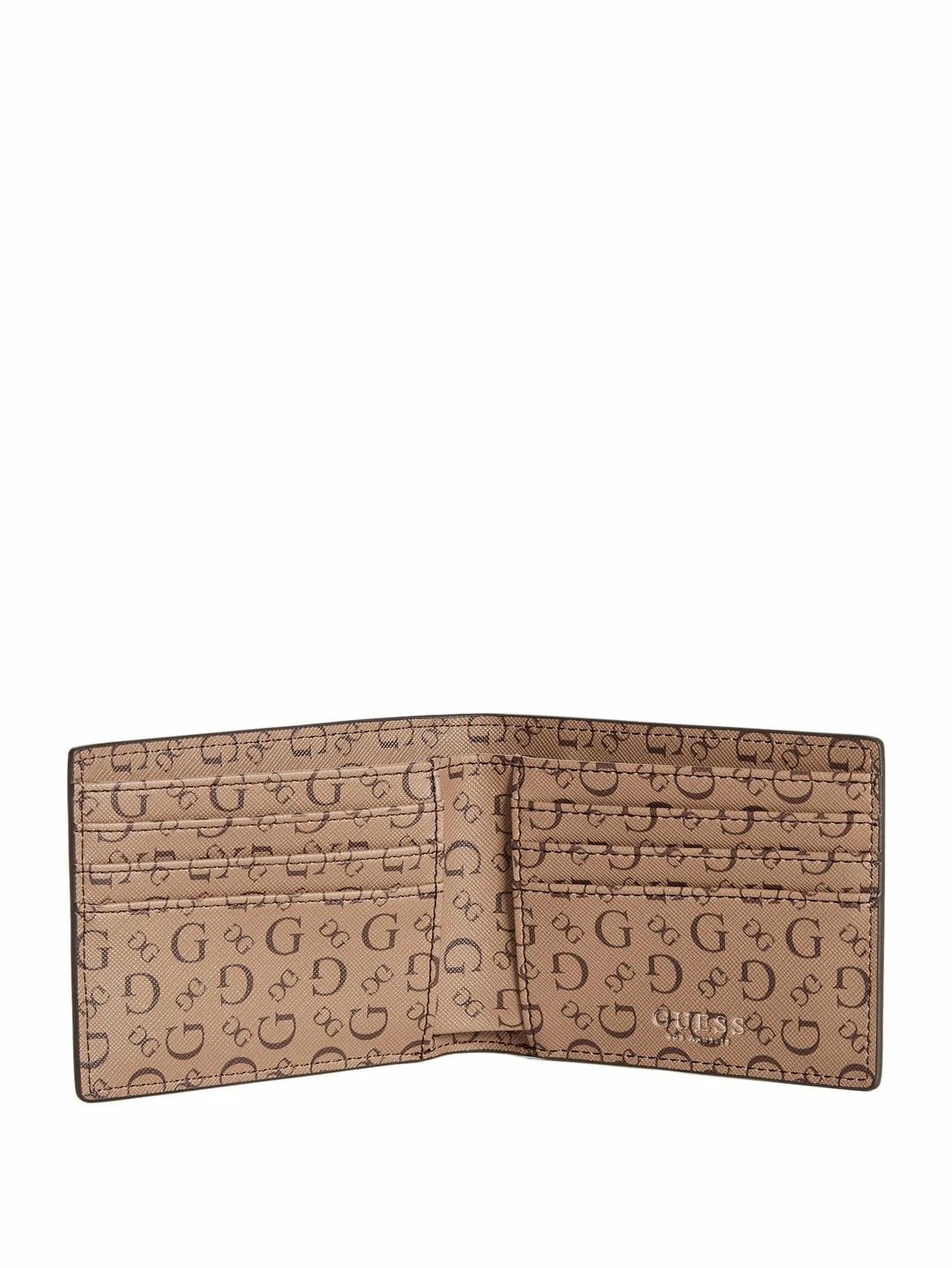 Keep your essentials in this faux-leather bifold wallet featuring an allover logo print and striped trim.