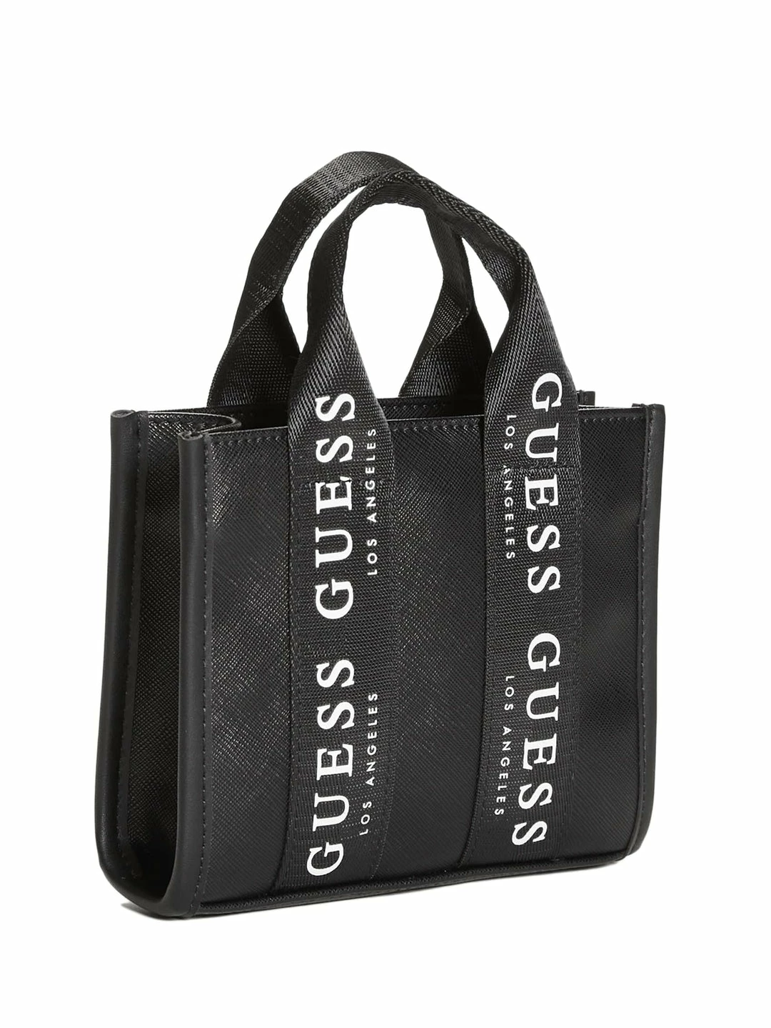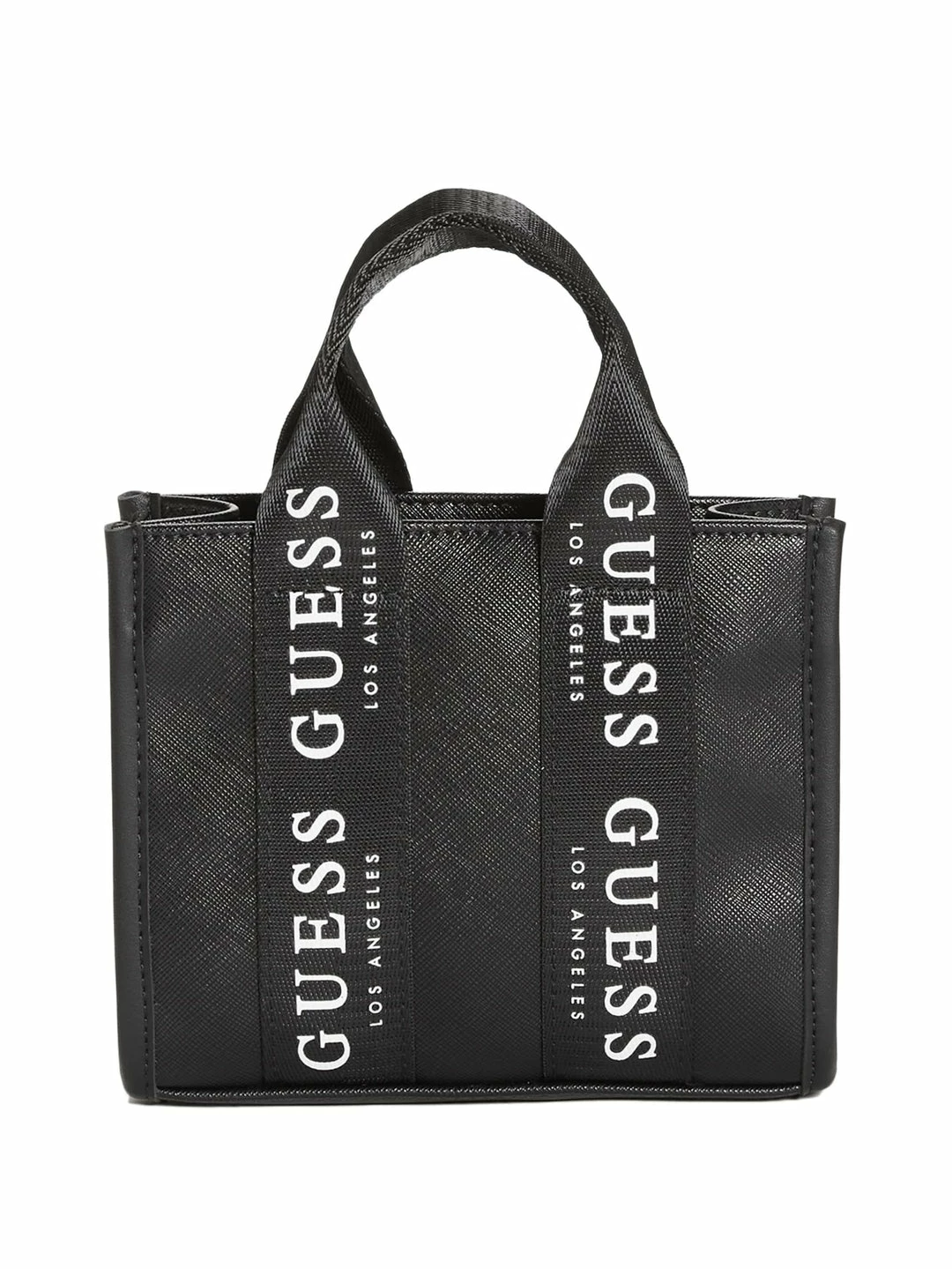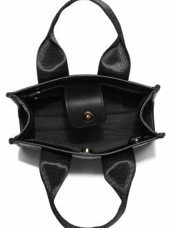 Saffiano faux-leather mini tote featuring logo-tape webbed canvas top handles and a detachable crossbody strap. Fold-over strap with magnetic snap-button closure.