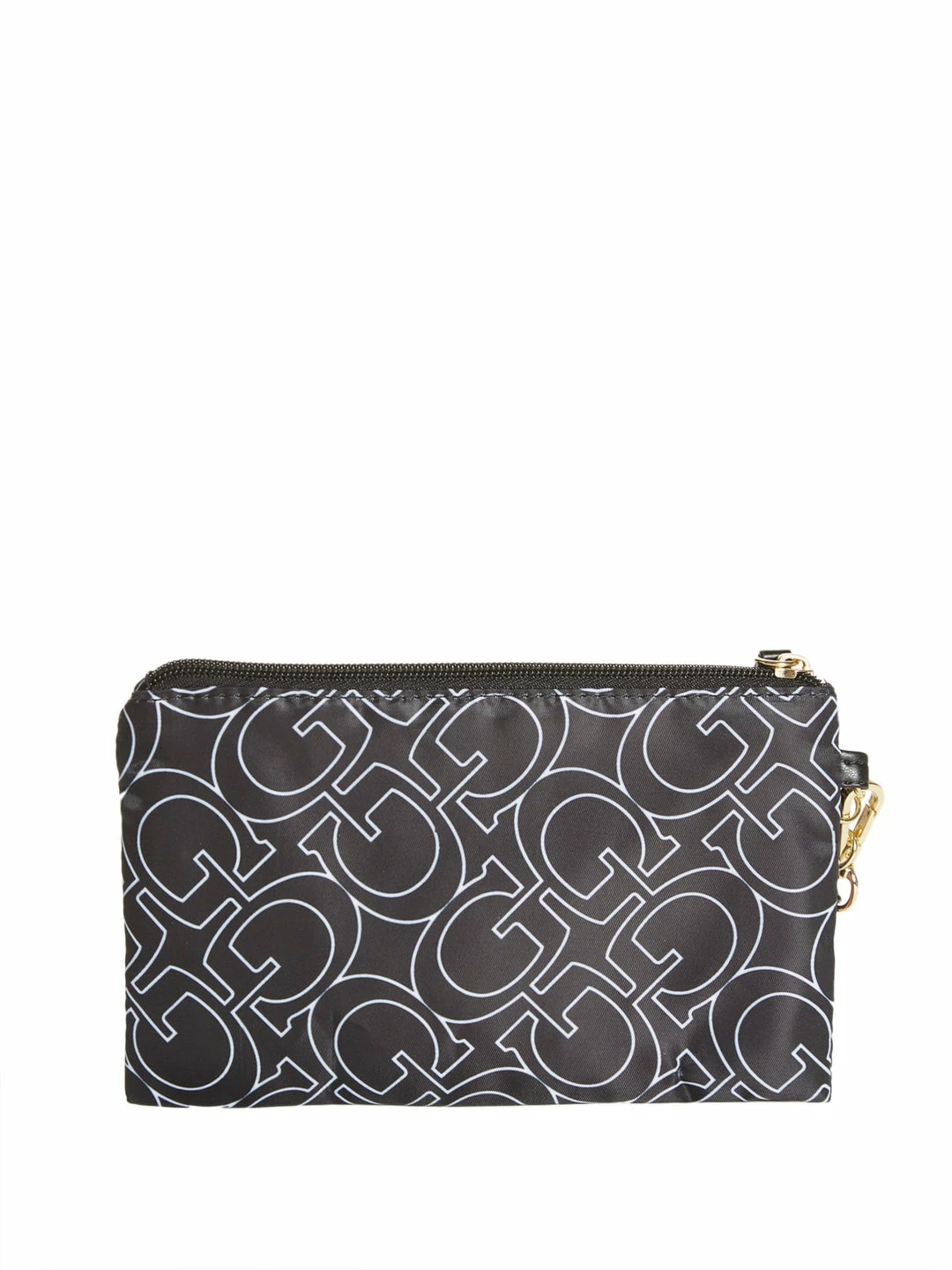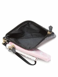 One for everything you need. Set of 3 nylon zip pouches in varying sizes featuring an array of logo prints. Top zip closures and connecting lobster clasp with wristlet strap.