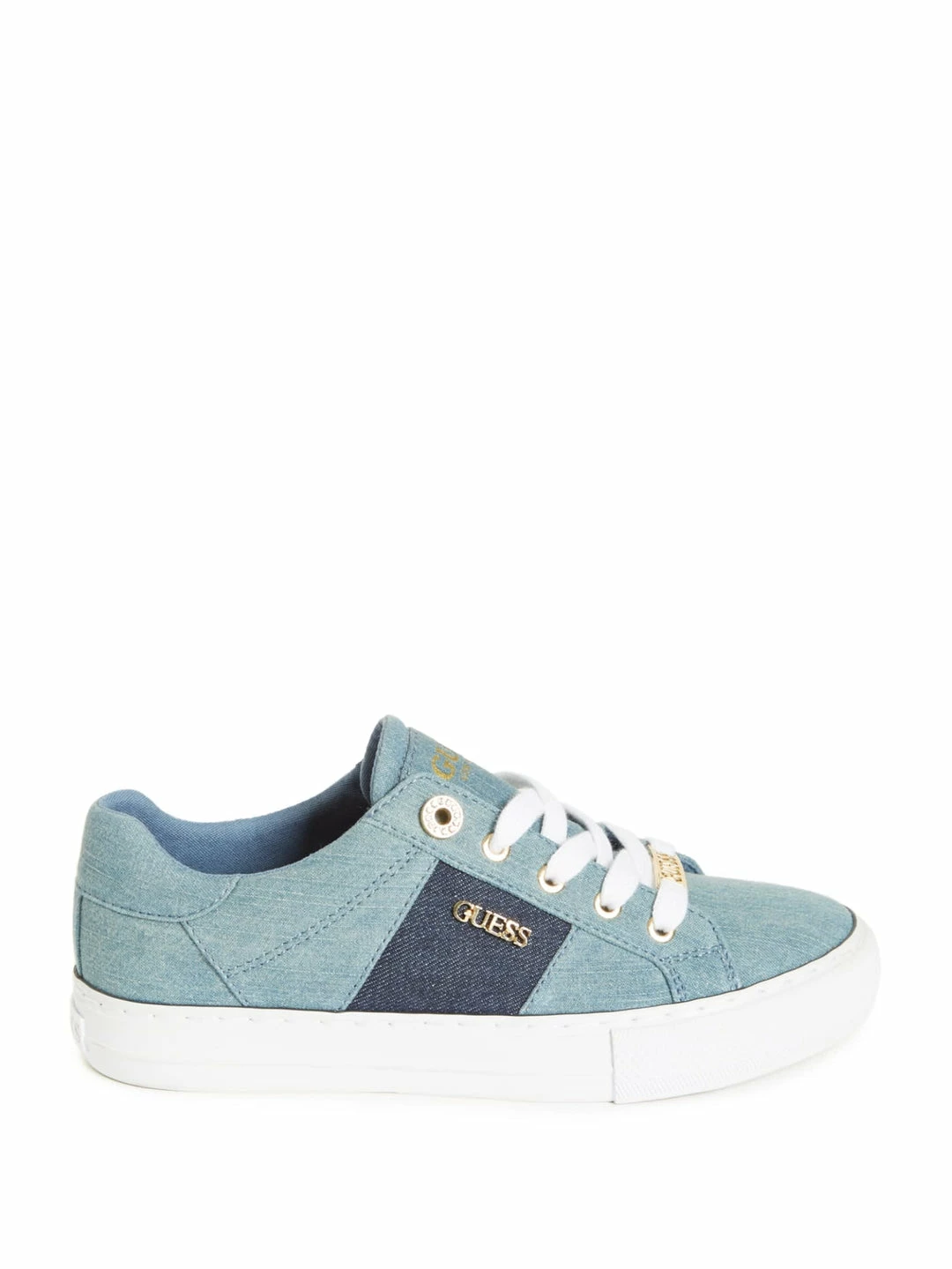 A casual staple, these low-top sneakers feature a denim exterior with logo-print paneling and lace-up vamp with rhinestone-adorned eyelets.