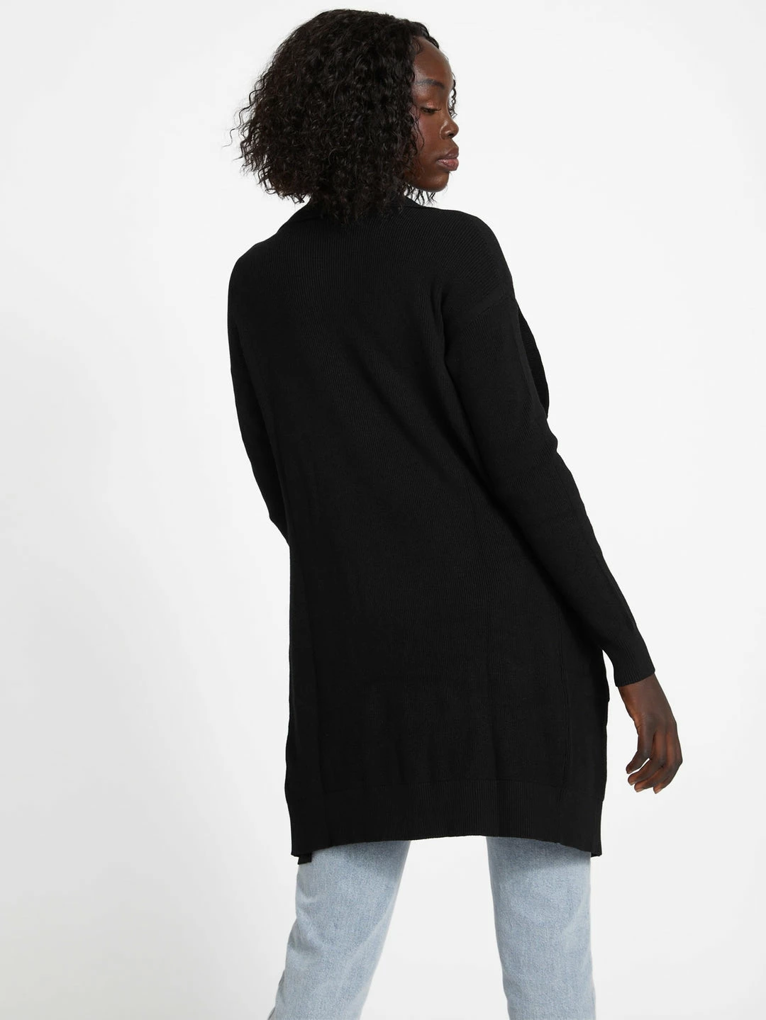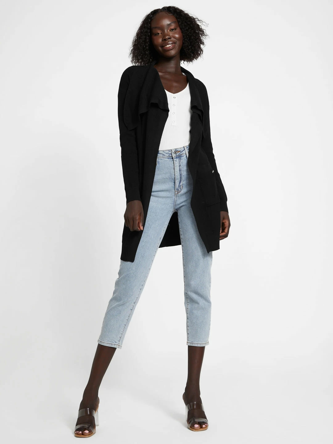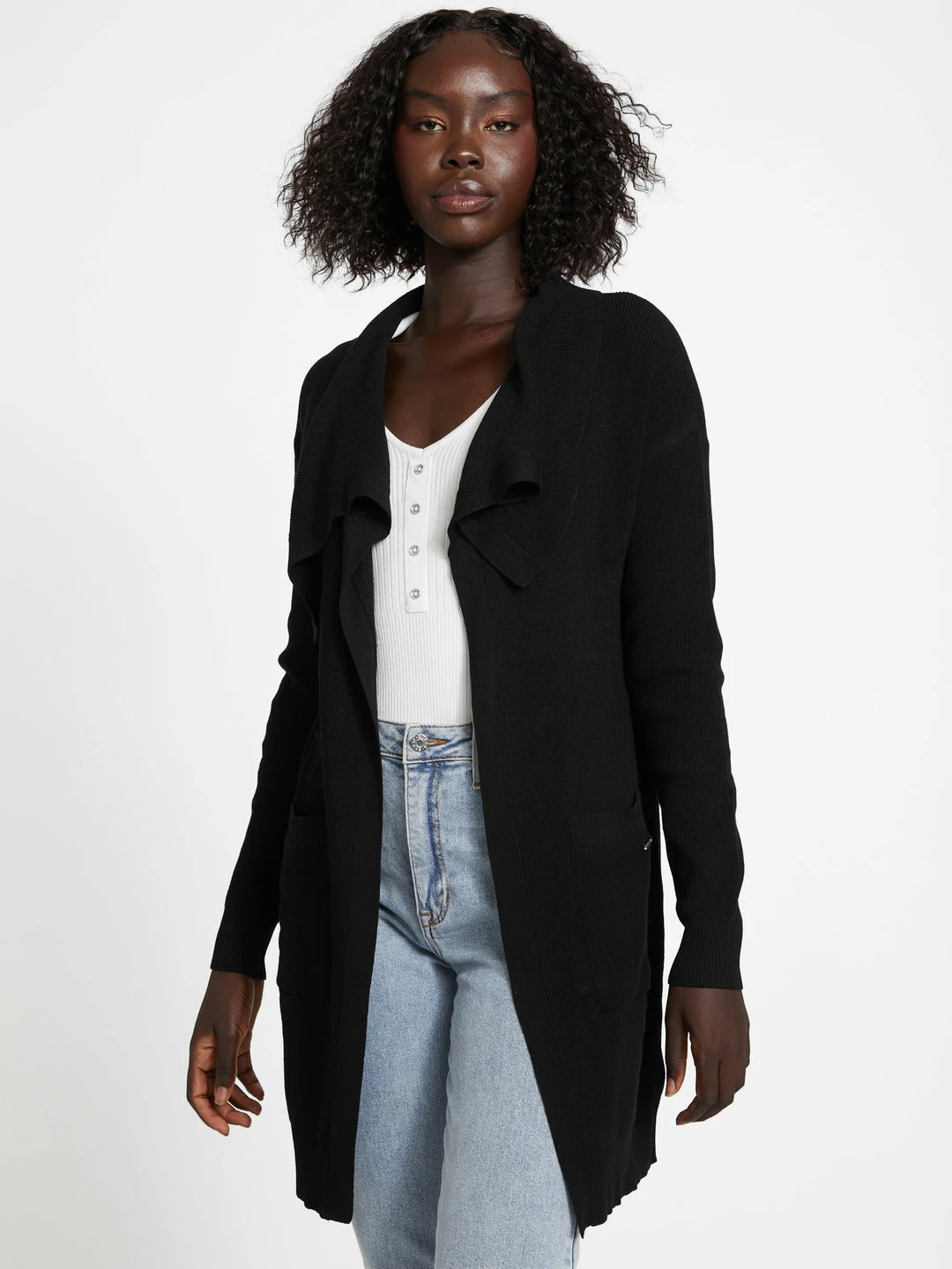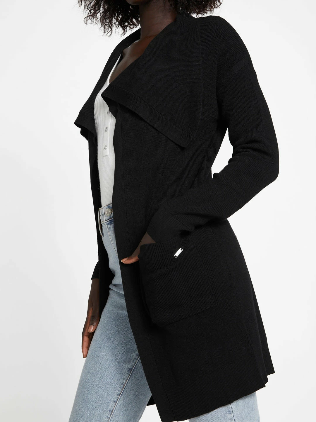 Wrap yourself in this soft, longline cardigan featuring wide lapels, an open front, slip pockets and long sleeves.