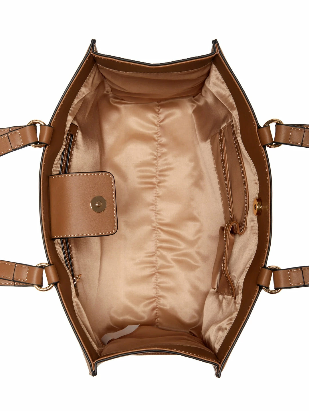 A carryall for everyday. Featuring a faux-leather construction with debossed logo, dual top handles and shoulder straps, gold-tone hardware and internal snap button closure.