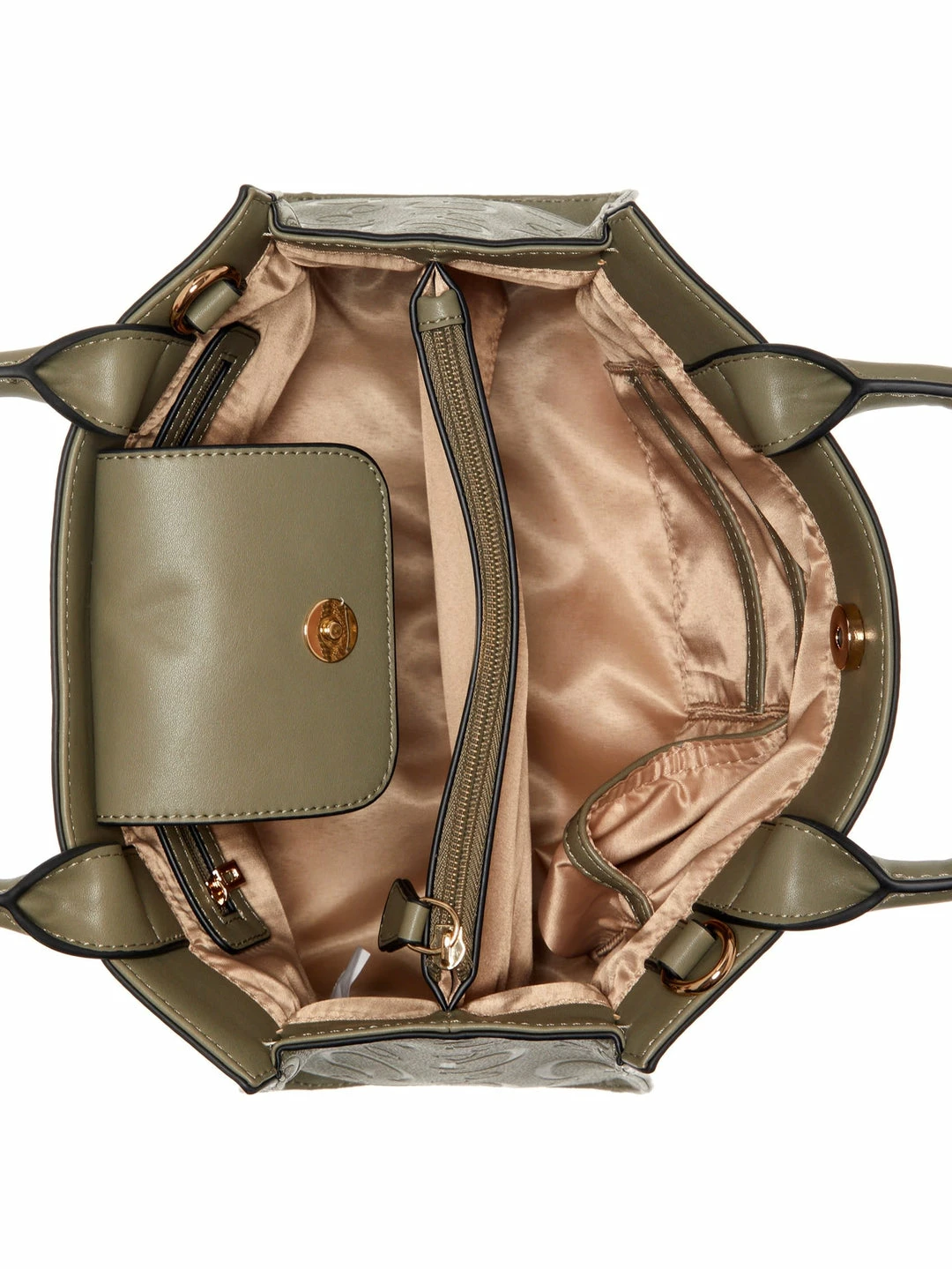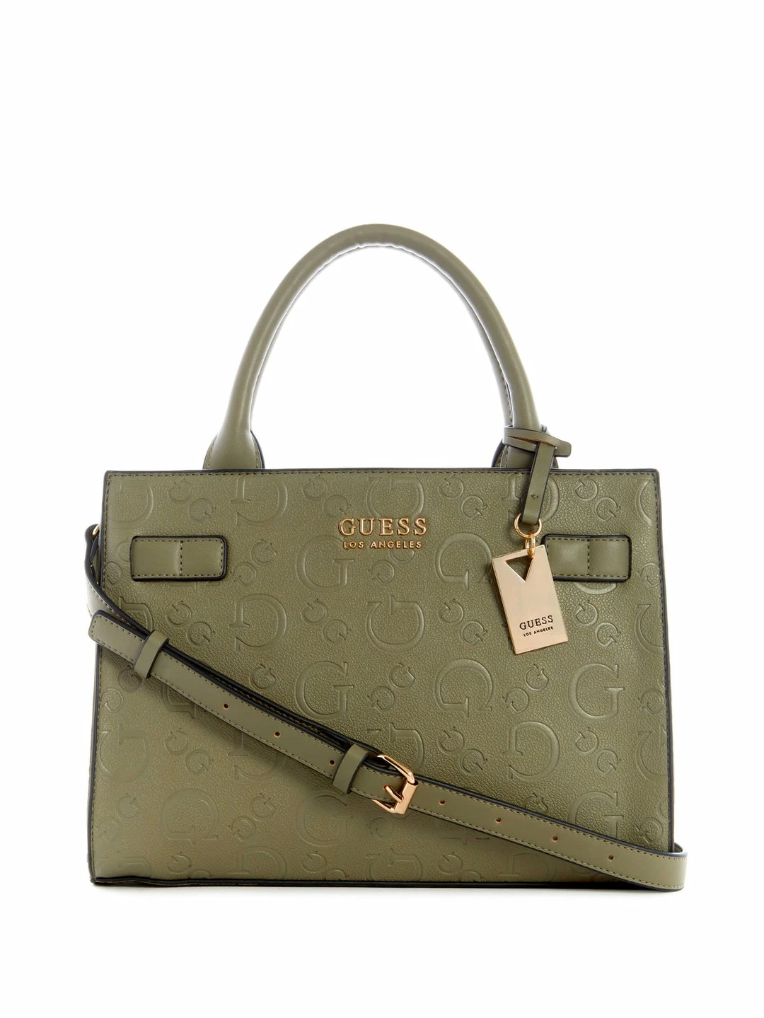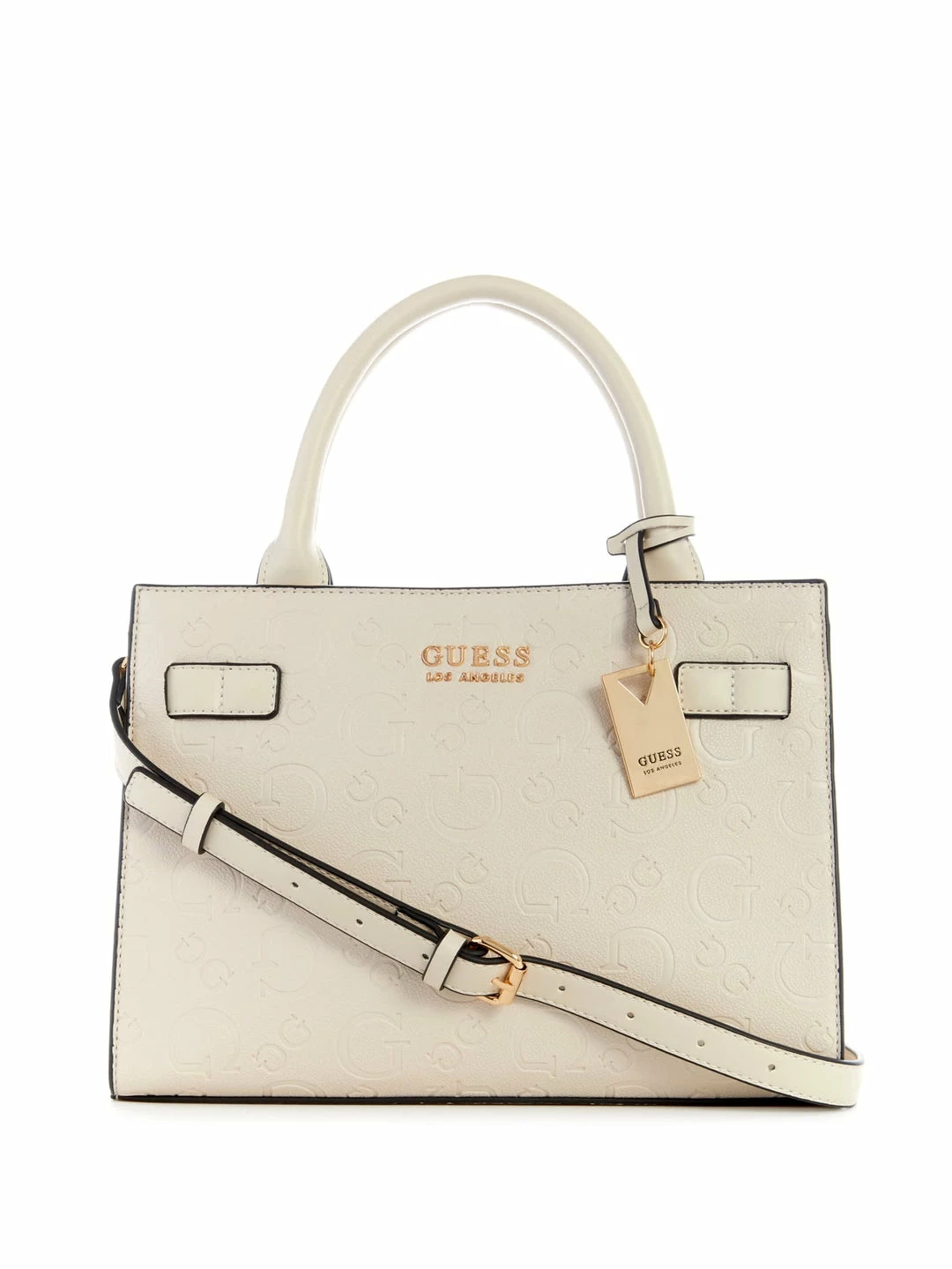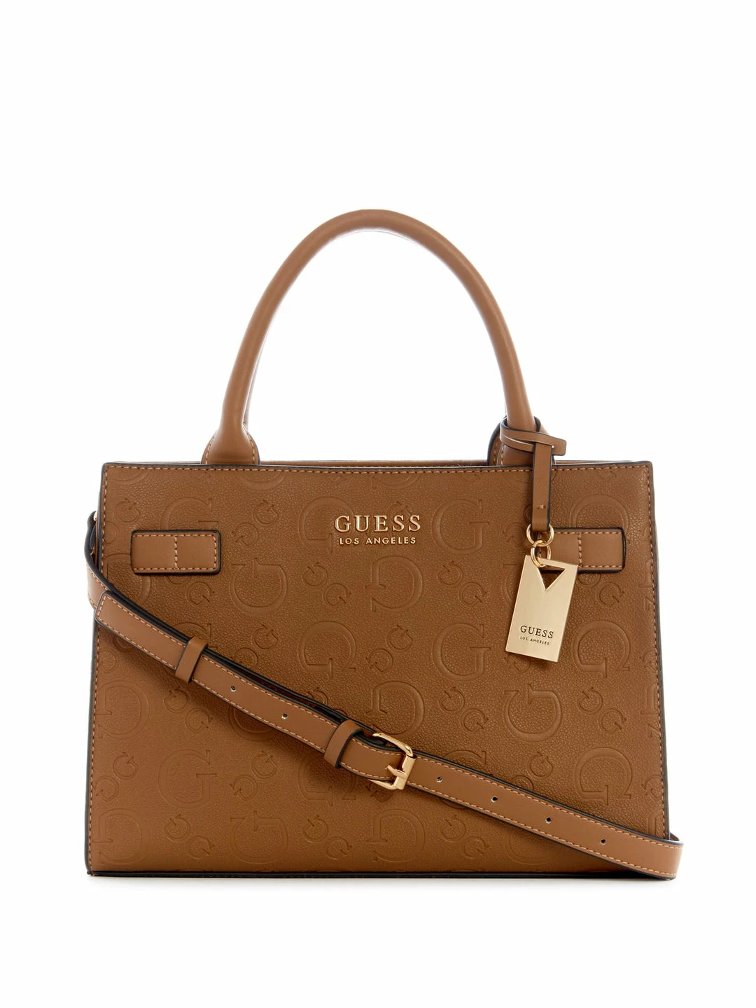 The perfect everyday companion, this satchel features faux-leather construction with allover debossed logo, internal organization and gold-tone hardware with a dangling logo.