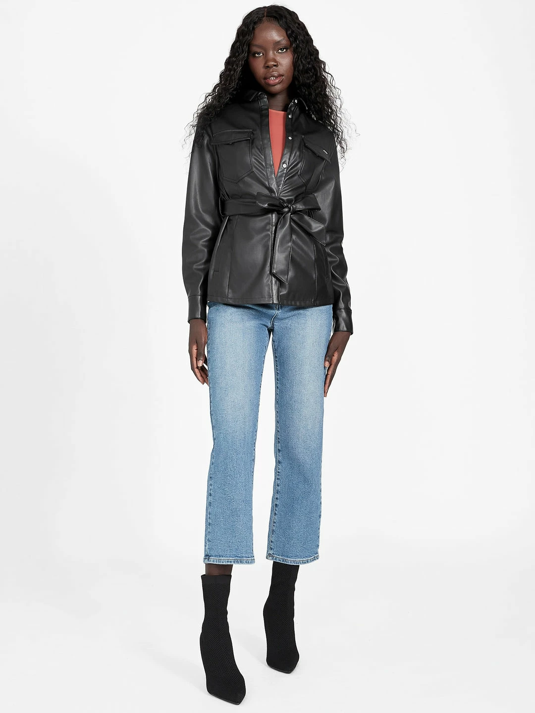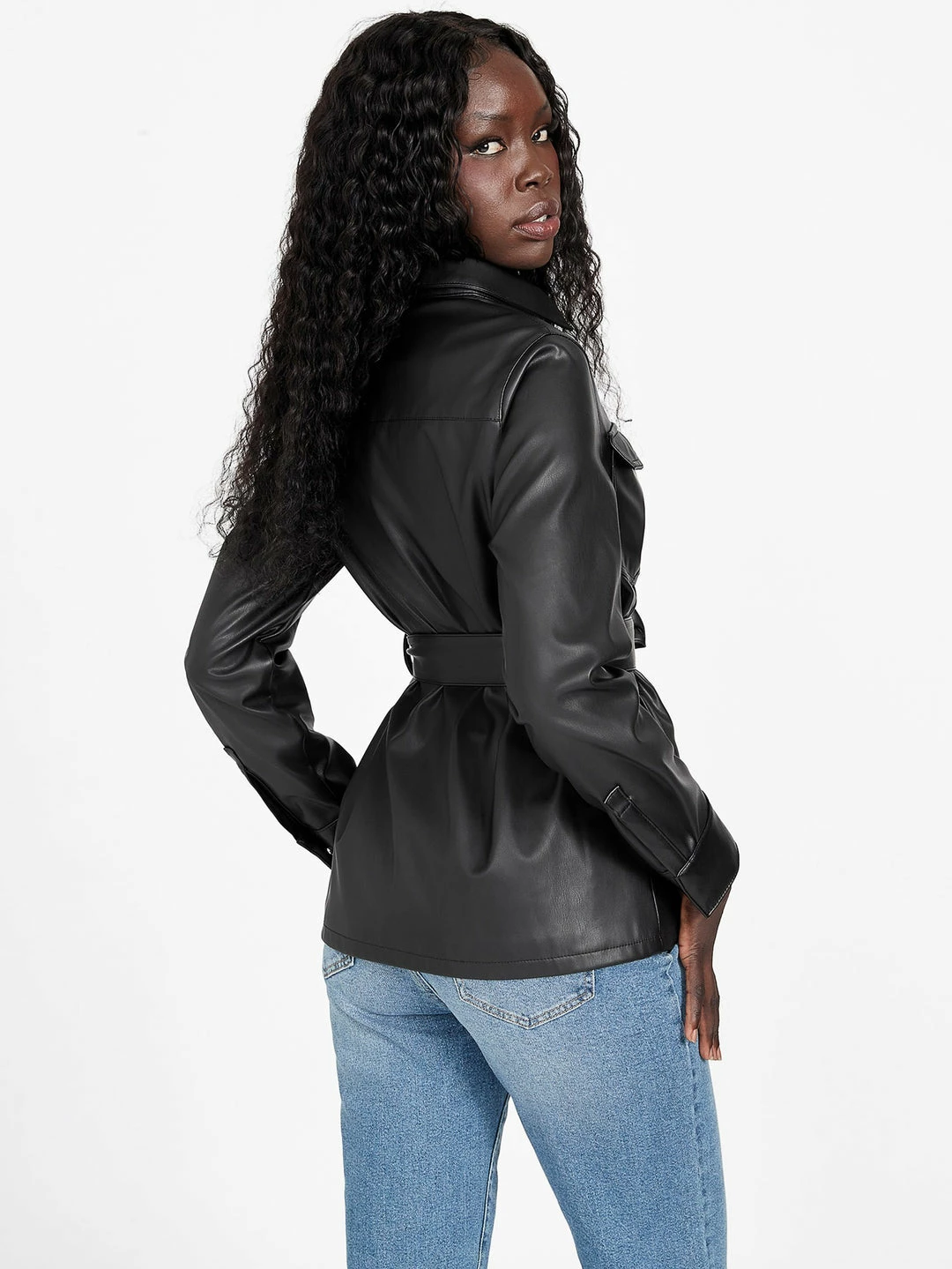Give your outerwear an edge. This longline jacket is designed with a faux-leather fabrication, folded collar, buttoned pockets, waist belt wrap and metal logo.