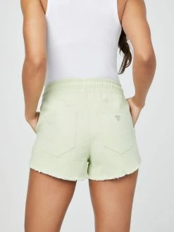 Revamp your off-duty look with these super high-rise denim shorts. Designed in a jogger style, with whiskered detailing, a frayed hem and an elastic drawstring waistband. Dual side slip pockets.