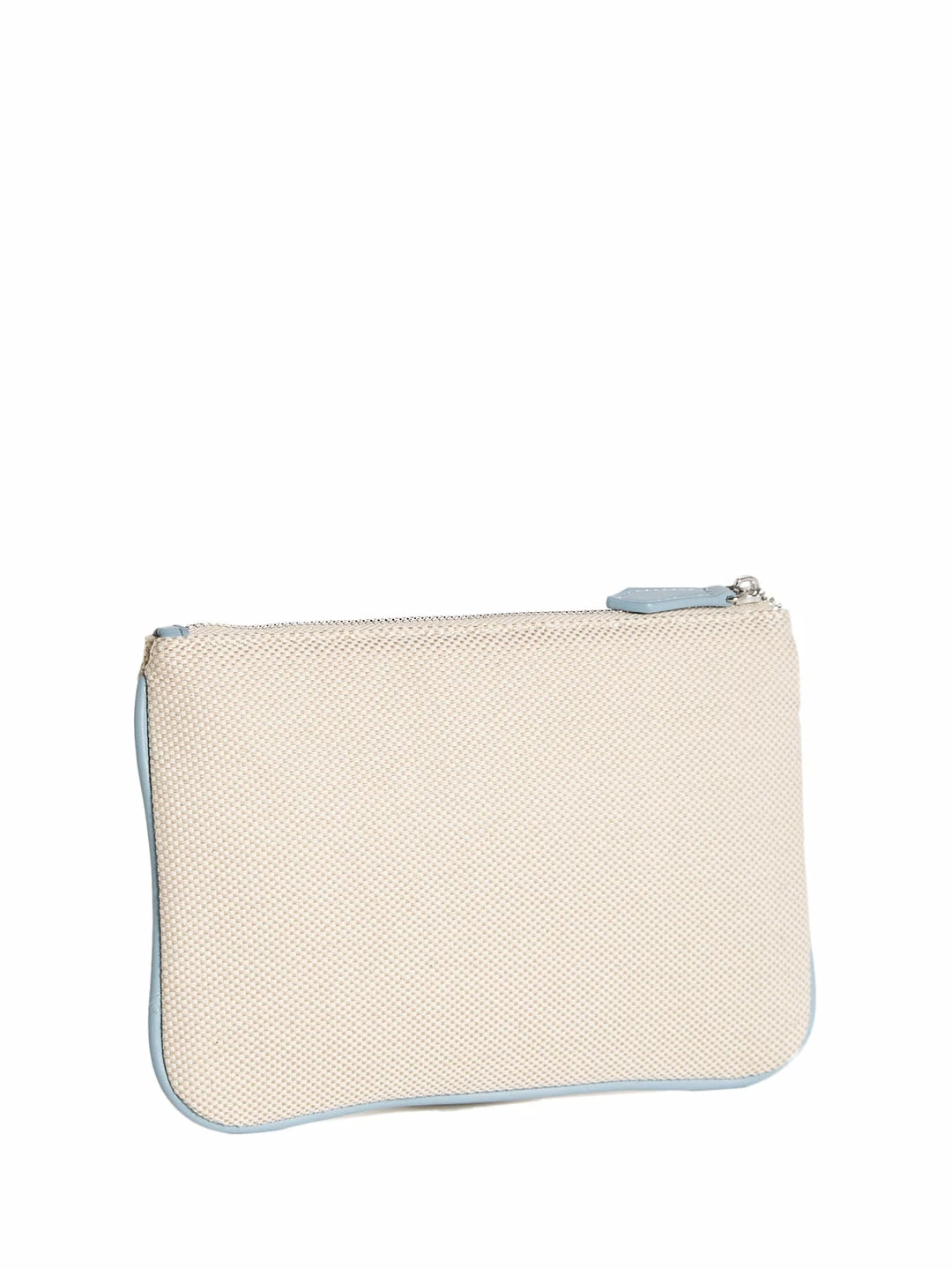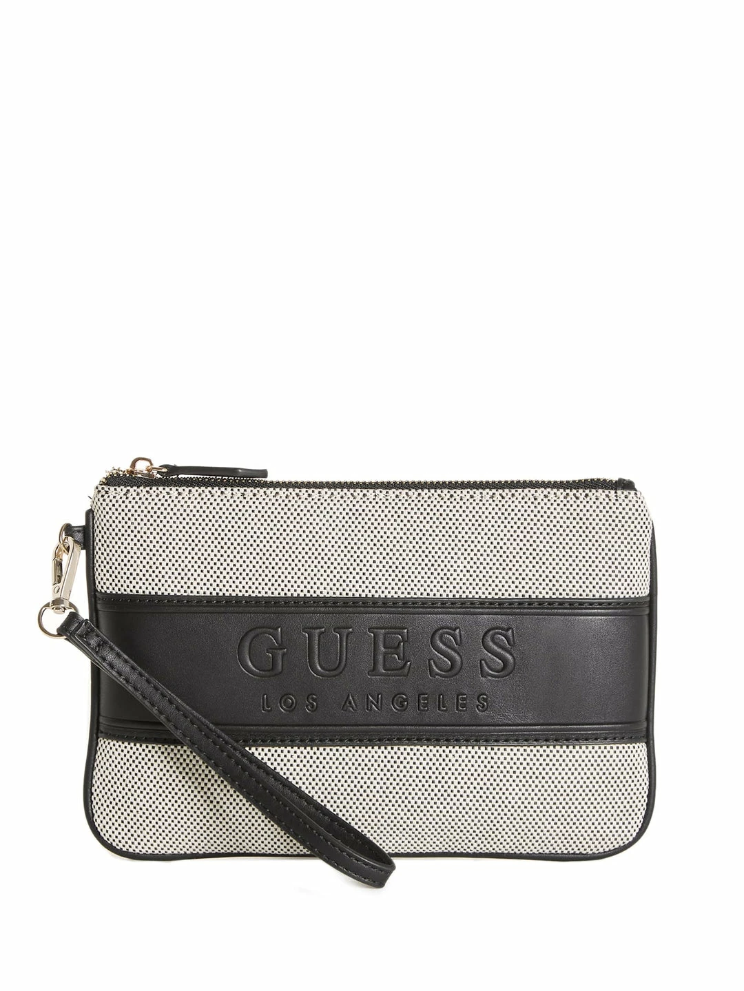 With errands in mind. Take along this canvas wristlet featuring faux-leather color-block trim and front stripe, embossed logo, zip-top closure and detachable wrist strap.