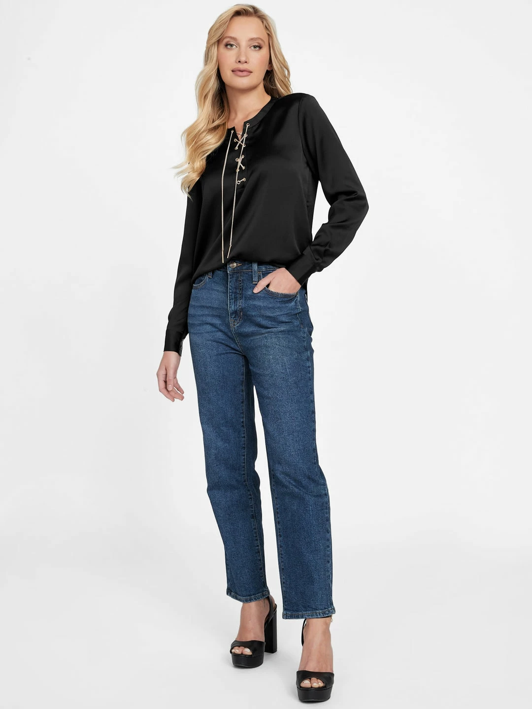 Ideal for dressing up or down, this satin top features a an open crew neckline with lace-up chain detailing and long sleeves.