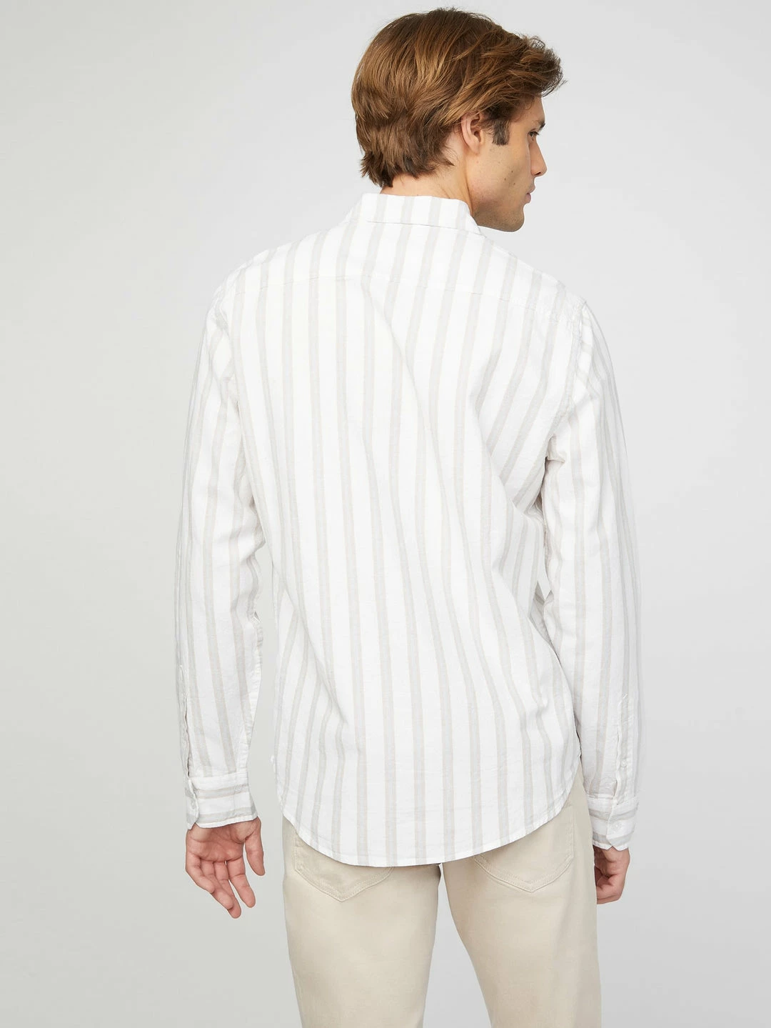 This linen-blend shirt features a button-front closure, allover striped pattern and folded collar. Water-saving fibers used.