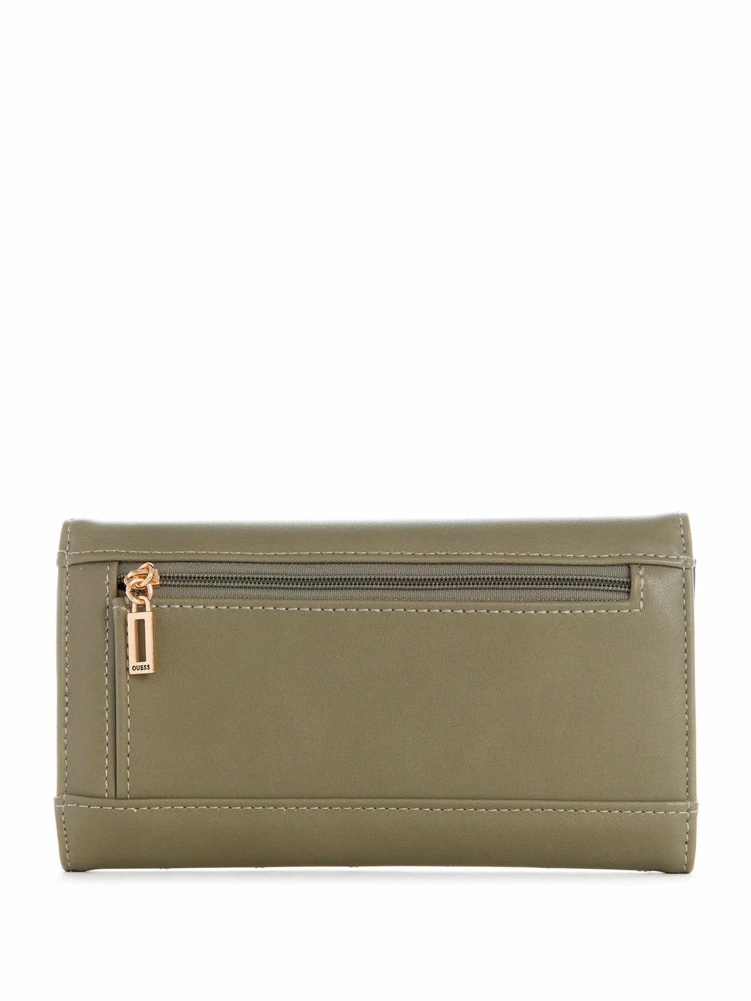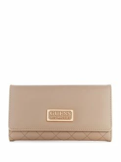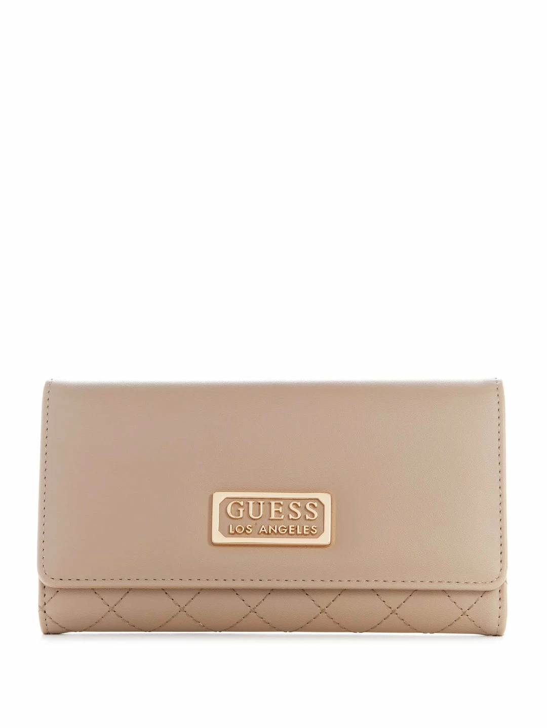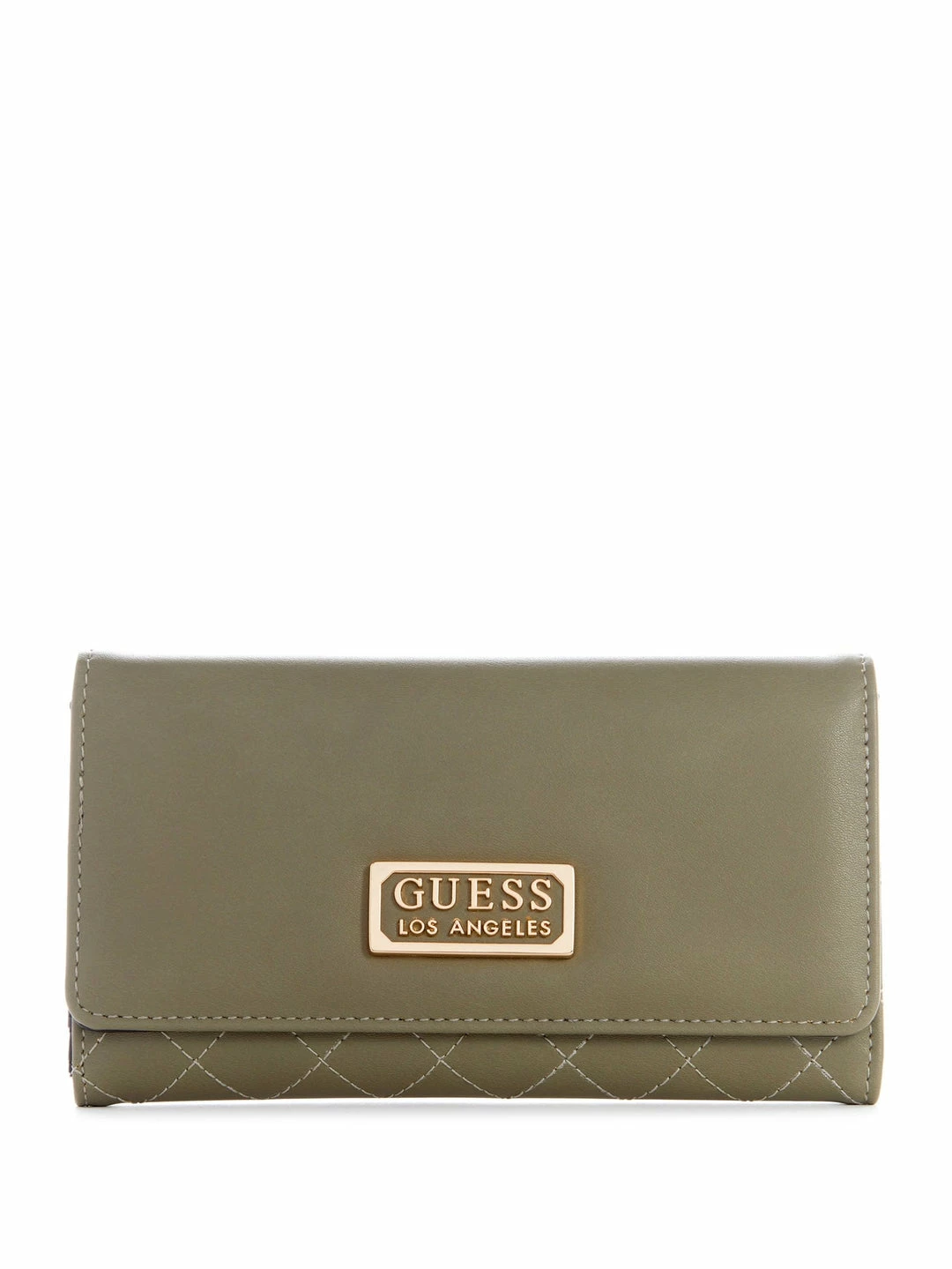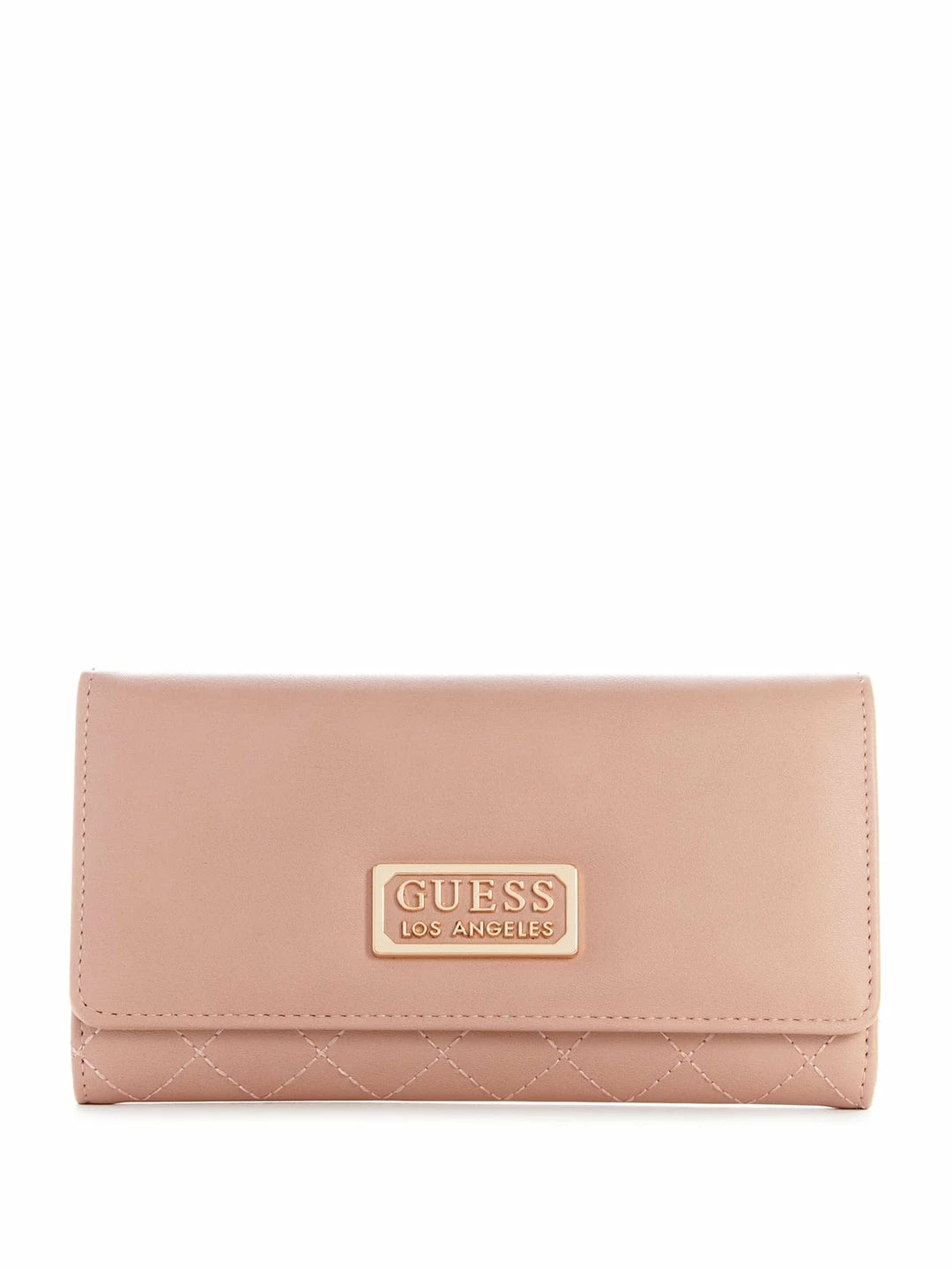 An evening out addition you deserve. Faux-leather slim clutch featuring a tri-fold design, smooth top with logo plaque, bottom quilted panel and back zip pocket.