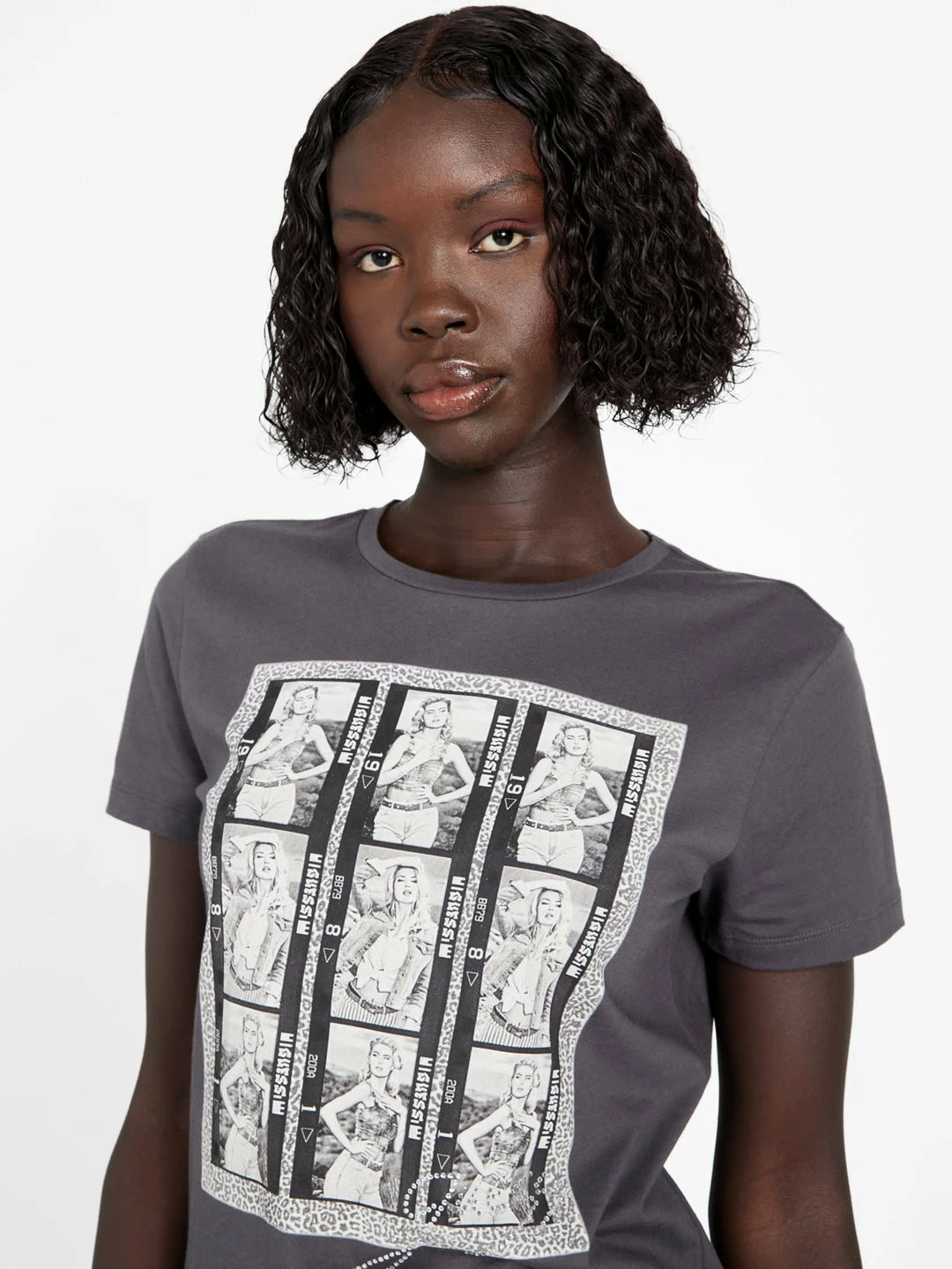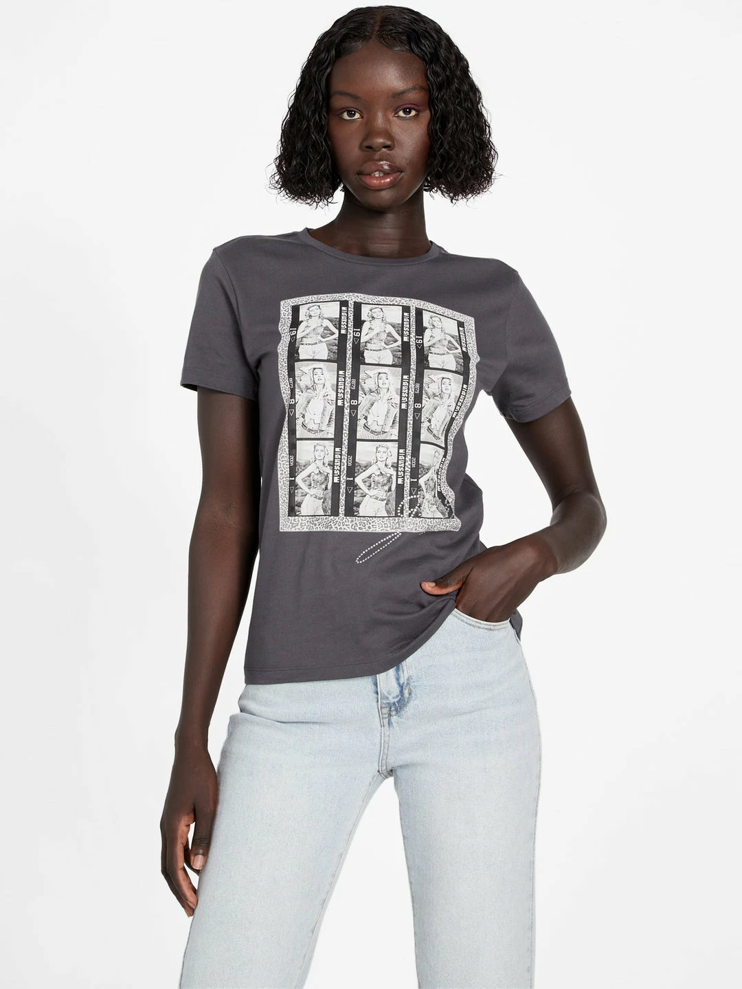 Strike your own pose in this jersey tee featuring film reel images with a leopard background and rhinestone logo, as well as a crew neckline and short sleeves.