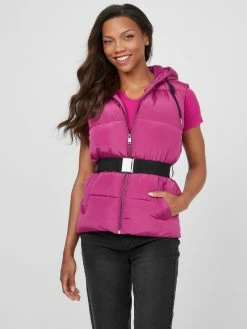 A padded vest with a chic twist, you’ll need this for chilly days. Featuring a drawstring hood, belted waist with logo, metal buckle and zip-up closure.