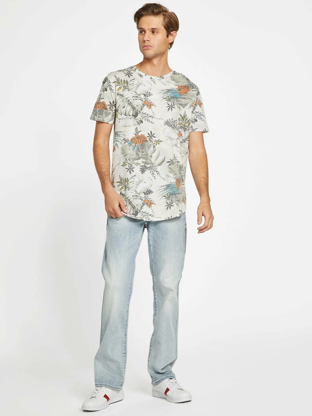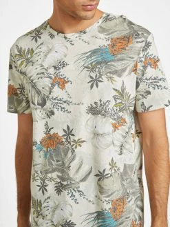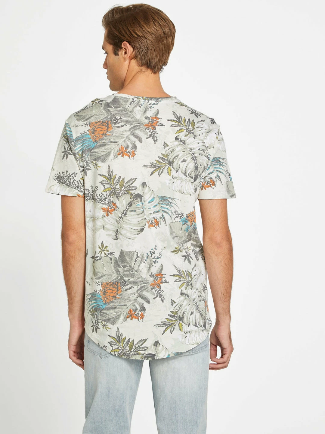 Explore new places with this crewneck tee designed with an allover tropical print and short sleeves.