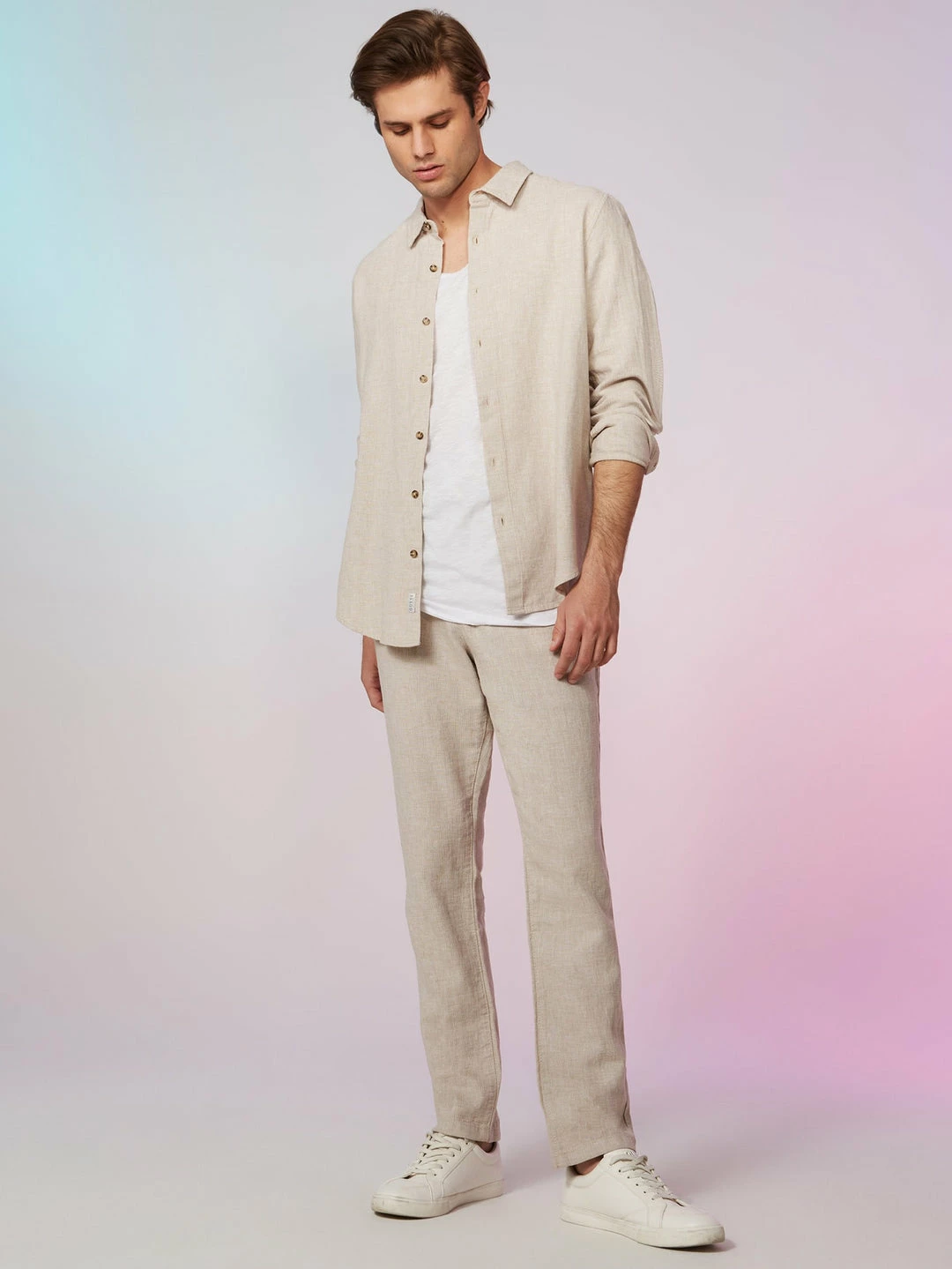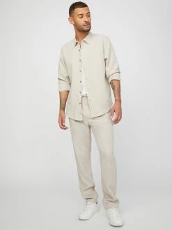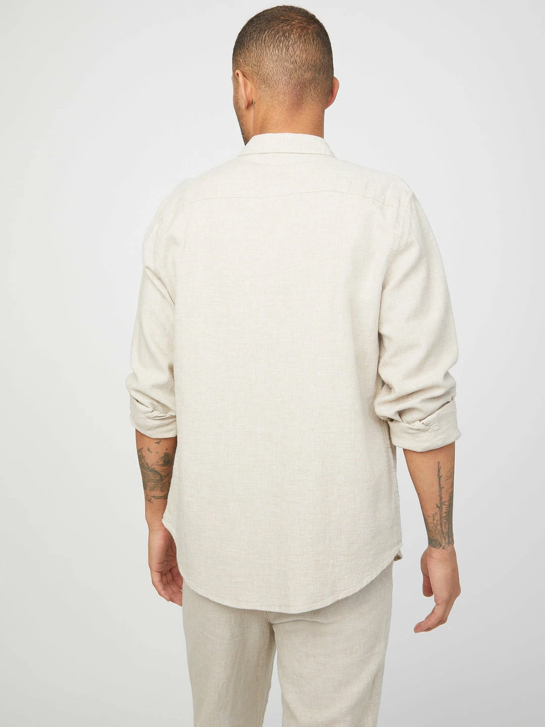 A lighter option to take you through the season, this linen-blend shirt features a button-front closure and folded collar. Water-saving fibers used.