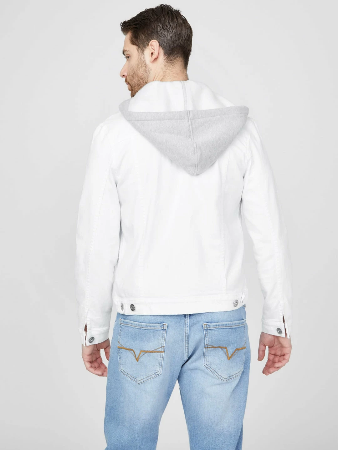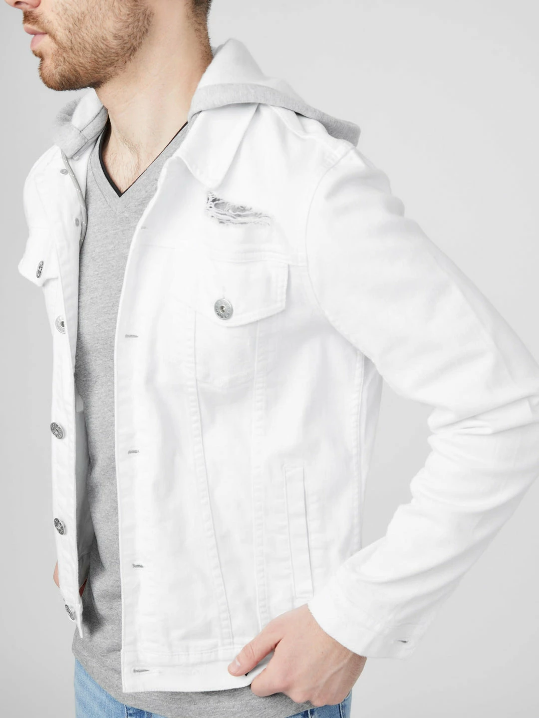 Add a classic finish to your look with this denim jacket, featuring a removable knit hood, button-front closures and slanted front pockets. Distressed details, front patch pockets and pointed collar.