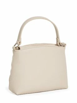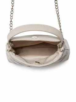 Your next accessory obsession, this mini satchel features a diamond-quilted design, logo emblem, top handle and chain crossbody strap. Interior fold-over flap closure.