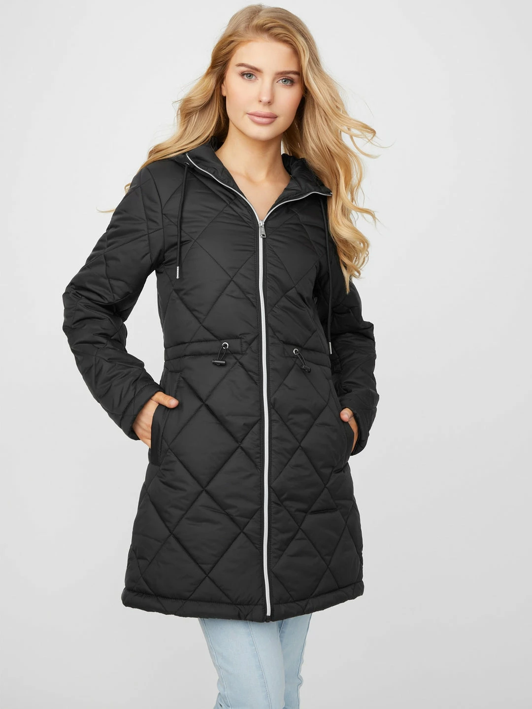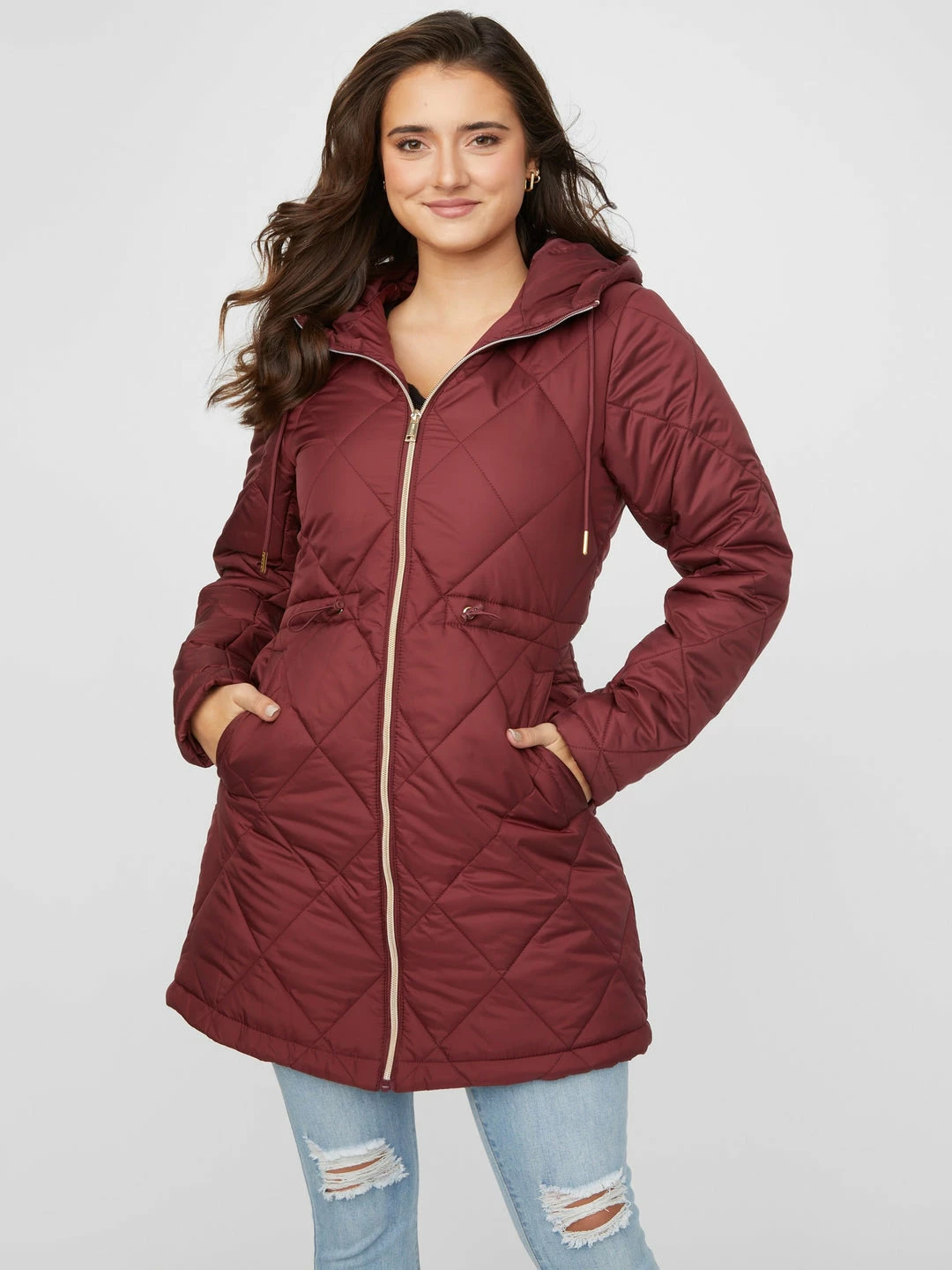Keep it cozy in this full-length padded coat featuring quilted detailing, zip-front closure, dual chest pockets and attached hood.
