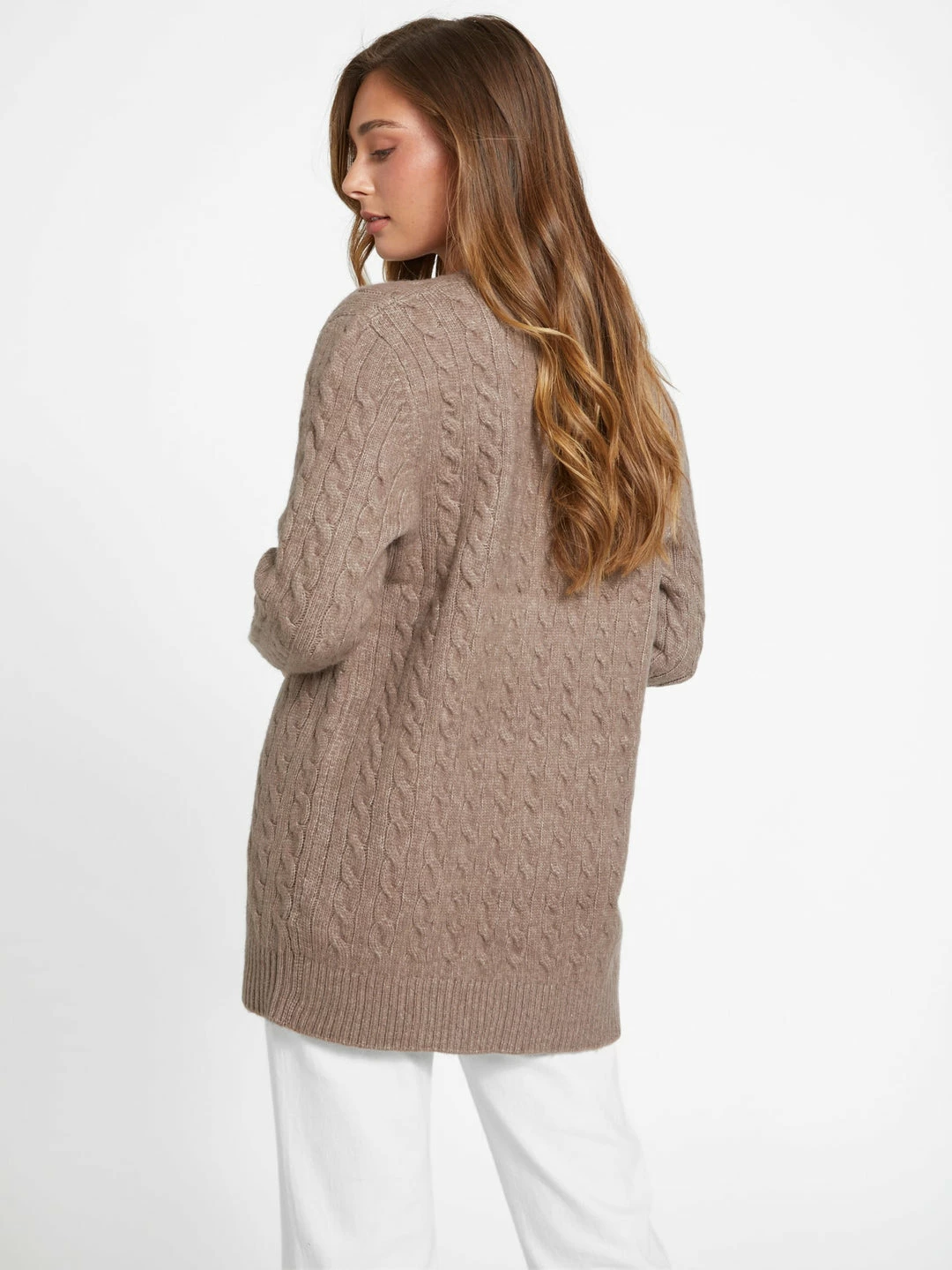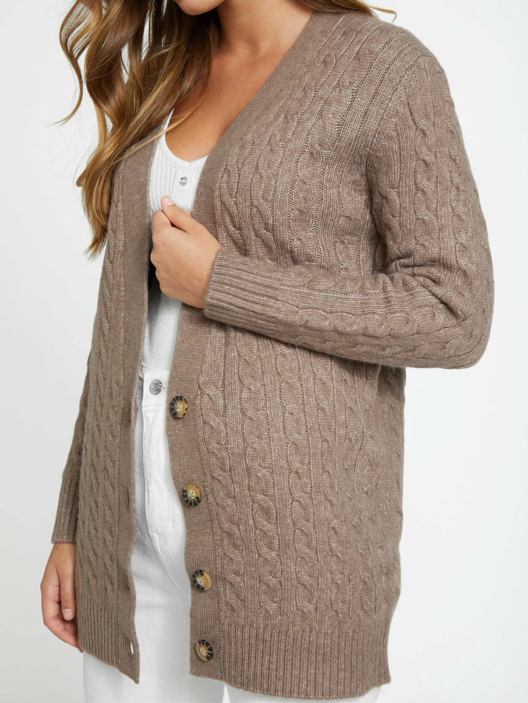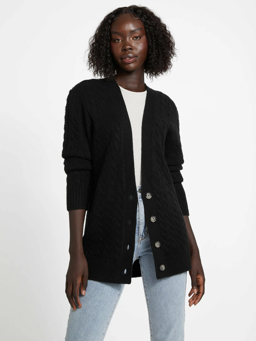 Keep warm and cozy in this cable-knit cardigan made from wool-blend fabric that features a V-neckline, long sleeves and ribbed trim. Button-front closure.