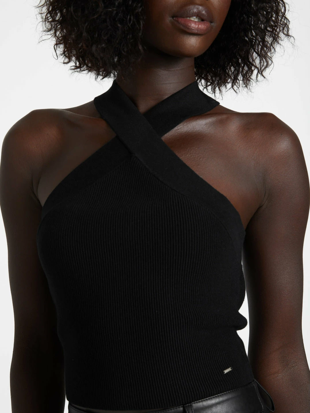 A sexy halter neckline highlights this ribbed sweater-knit top featuring a crisscross back and a sleeveless fit.