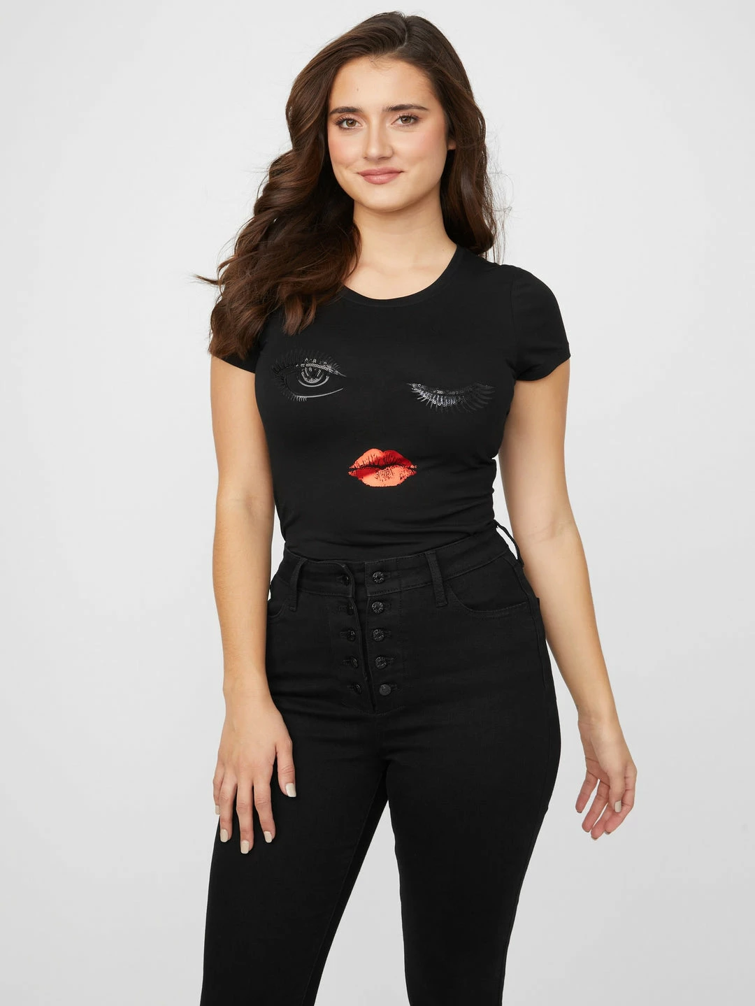Embrace the glamour of this crewneck tee featuring an abstract foil face graphic at front.
