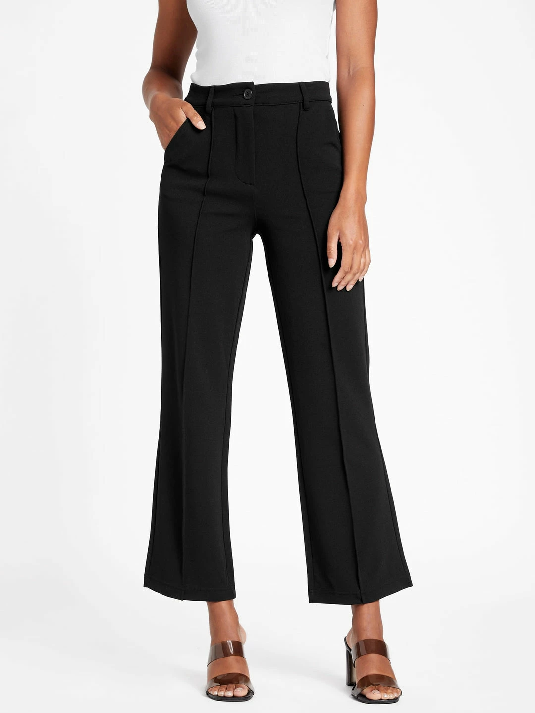 An office-ready pair of crepe pants featuring an ankle length, front pintuck princess seams, slant pockets and a relaxed fit.