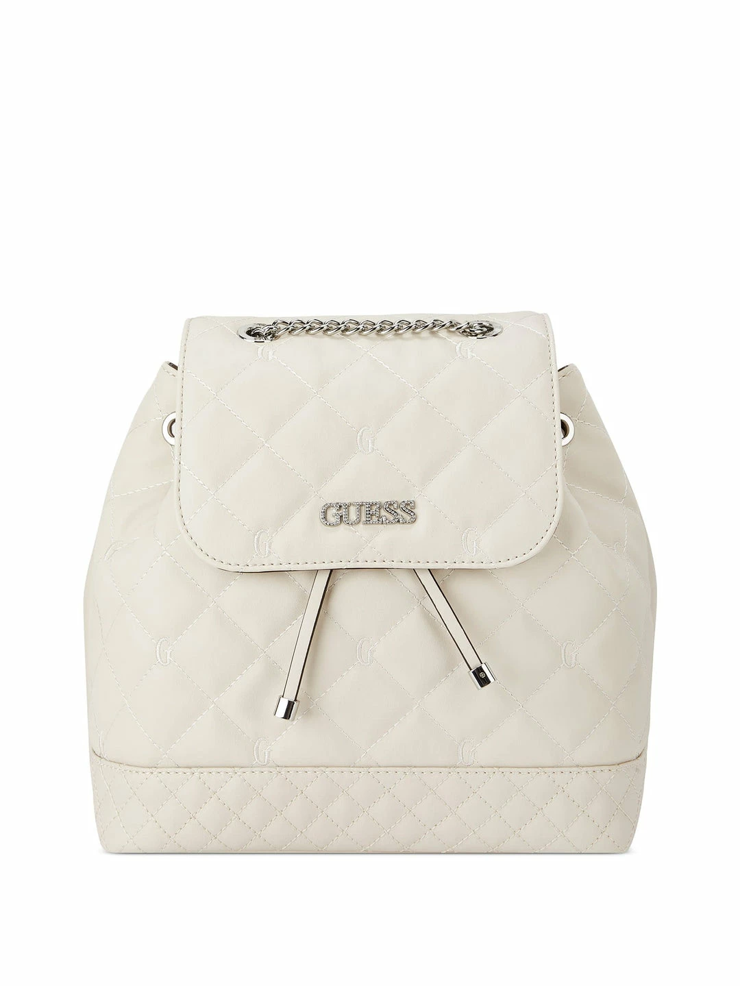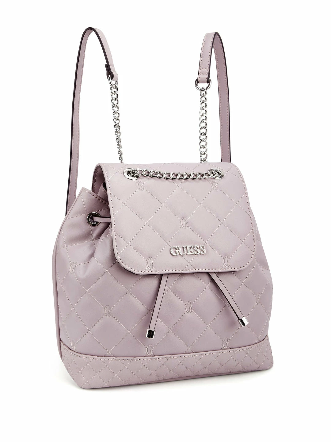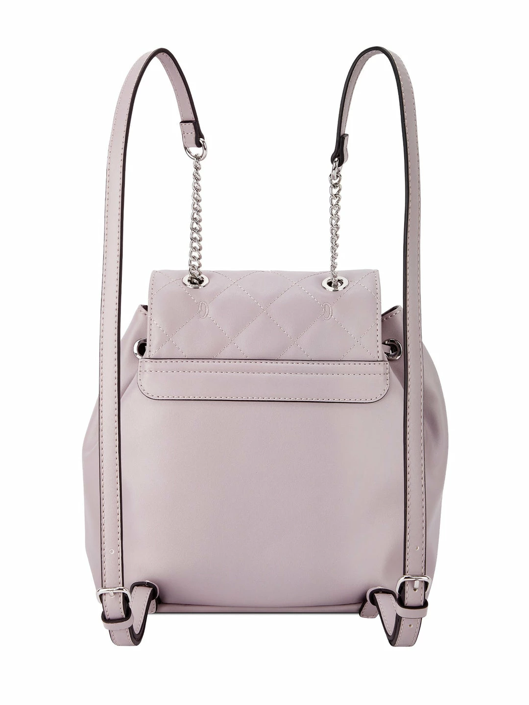 Take this faux-leather backpack everywhere, featured with an allover quilted design, a top chain strap, drawstring interior closure and fold-over flap external closure.
