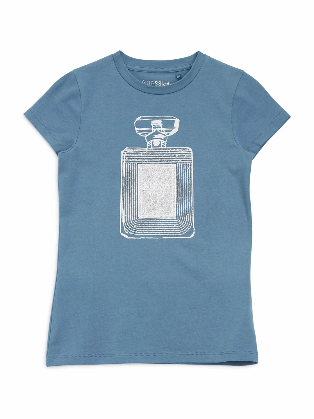 Made for someone extra sweet, this short-sleeve crewneck tee features a perfume graphic design with logo and glitter detailing.