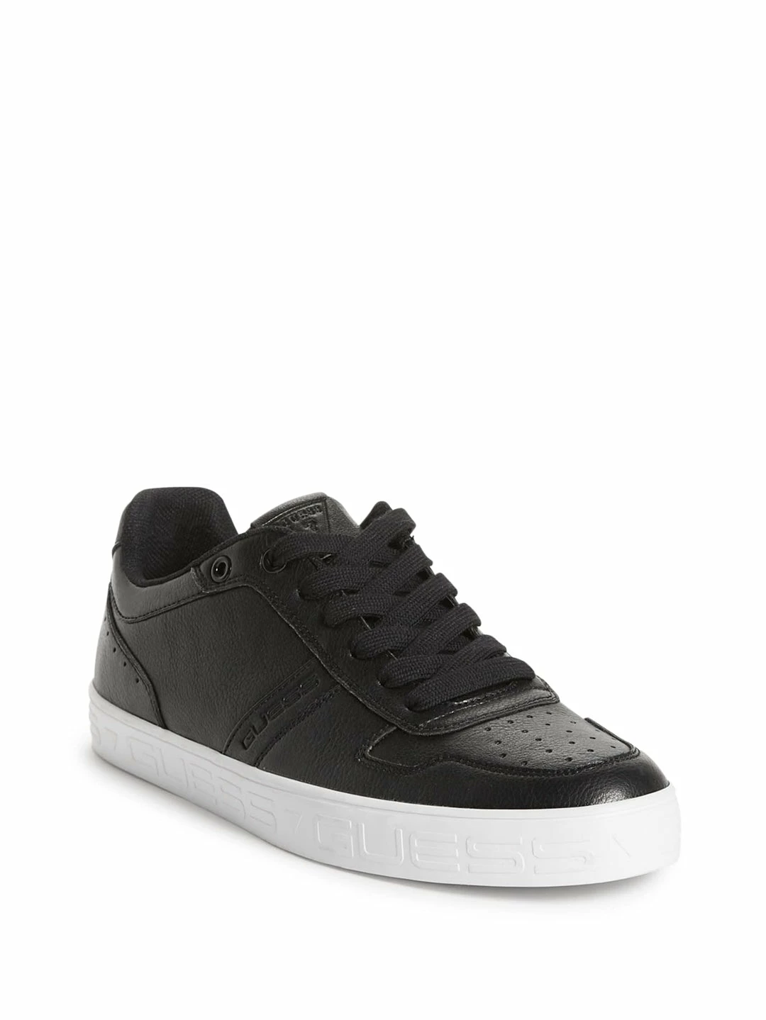 A slick pair of faux-leather low-top sneakers featuring a logo embossed sole, perforated round toe, debossed side logo and lace-up closure.