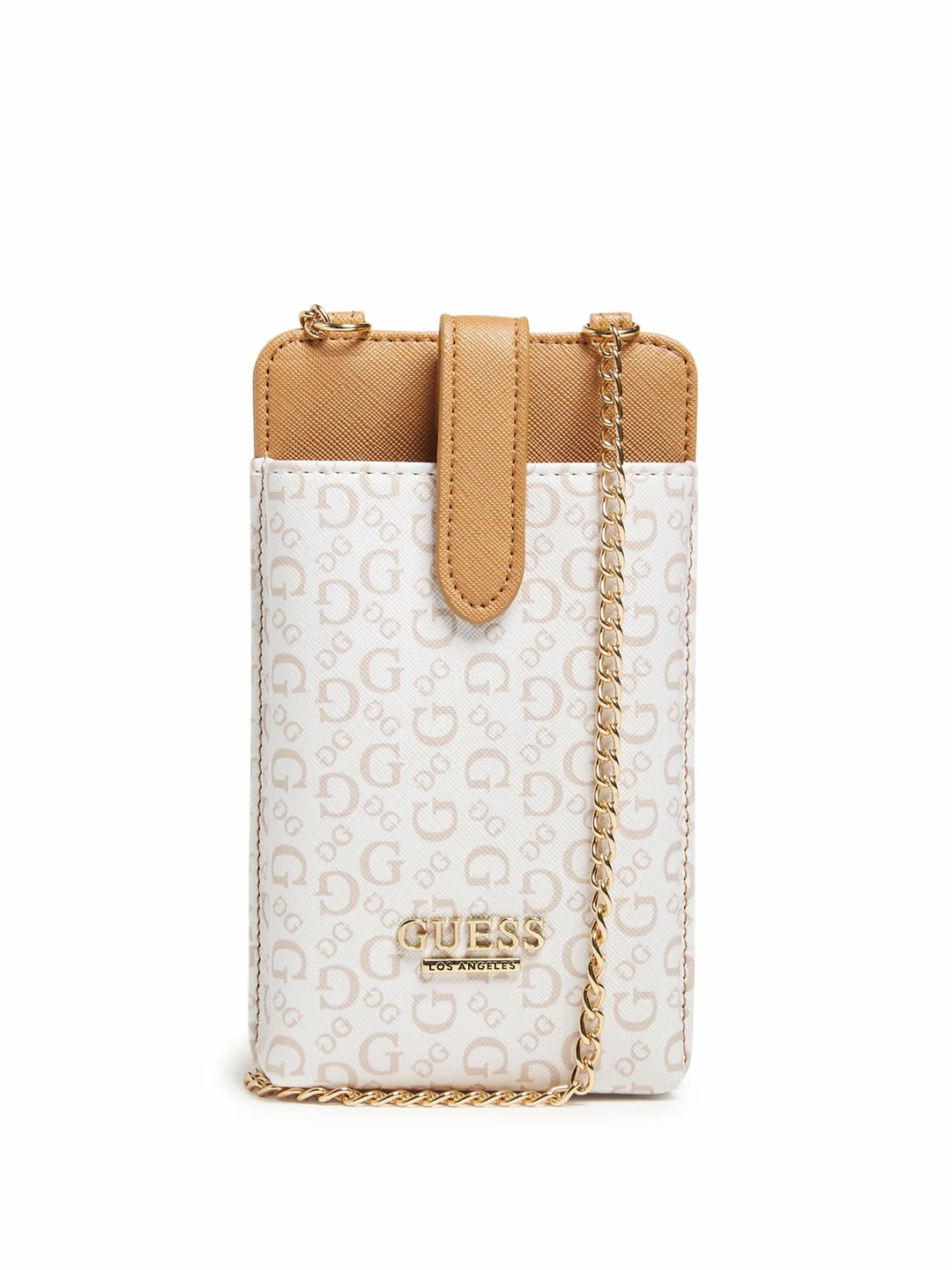 Keep your essentials close with this faux-leather phone crossbody. Featuring a front logo emblem, chain strap, back zipper pocket and strap with snap closure. Solid and logo-print designs.