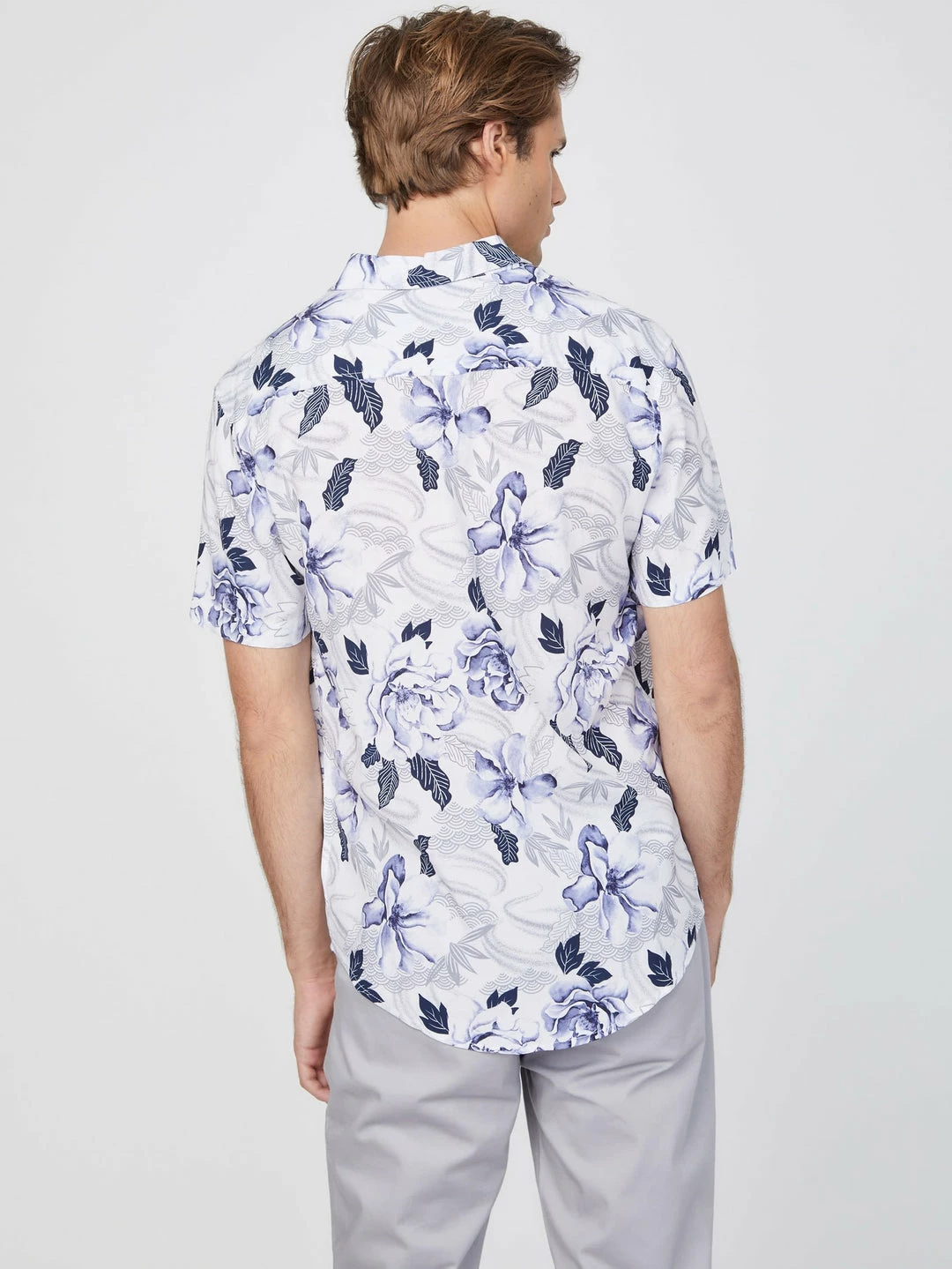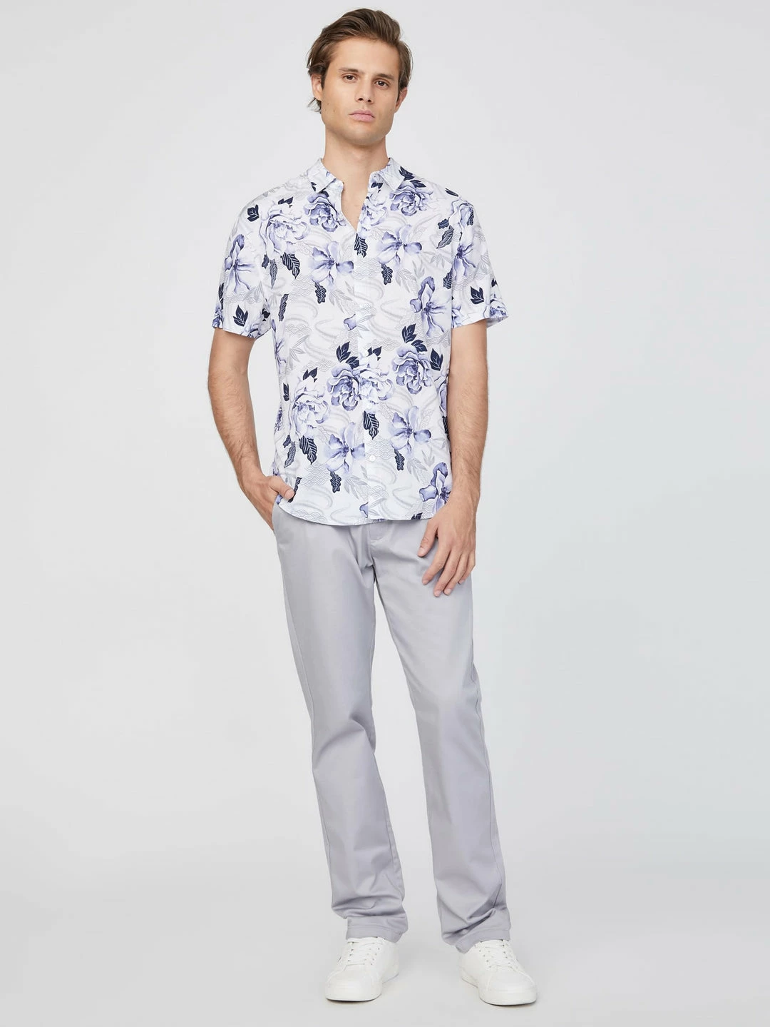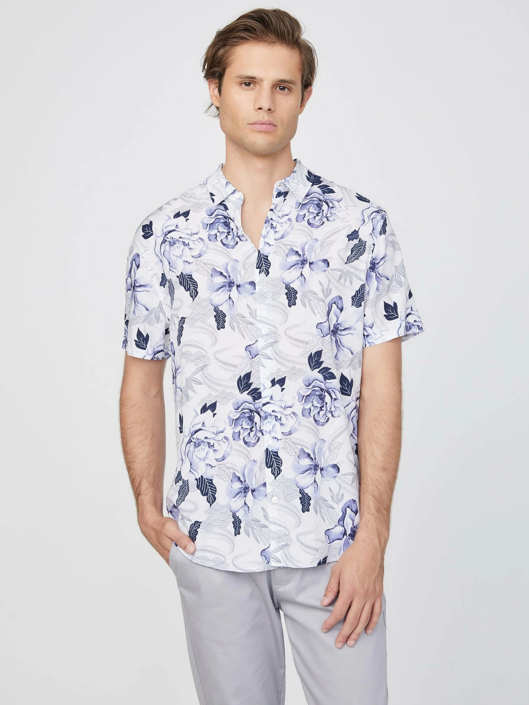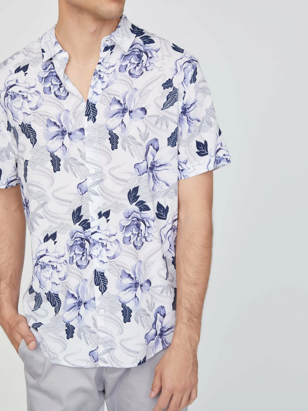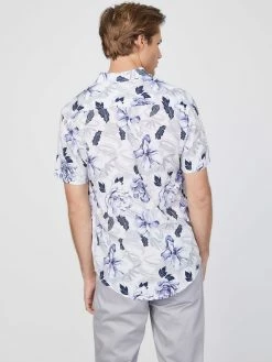 Crafted in a lightweight material, this short-sleeve shirt features a folded collar and allover island-inspired floral print.
