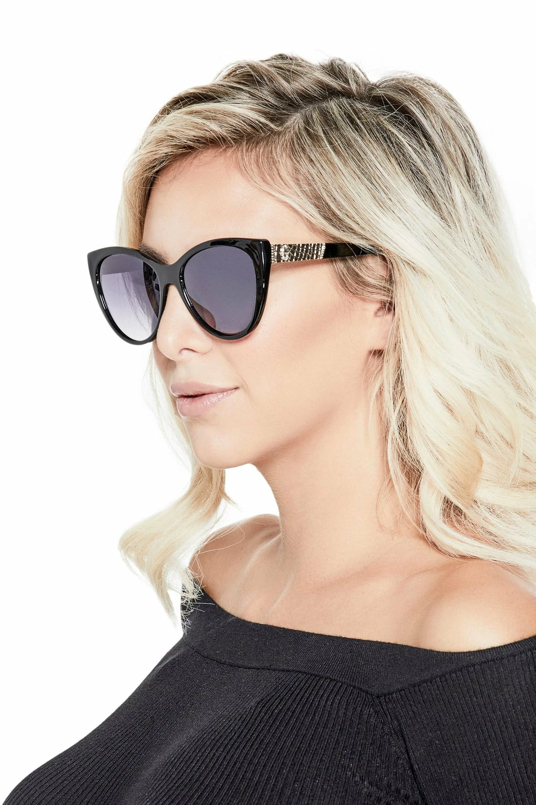 Embrace retro vibes with this pair of plastic cat-eye sunglasses, featuring tinted lenses, metal faux-snakeskin trim, and rhinestone-embellished logo details.