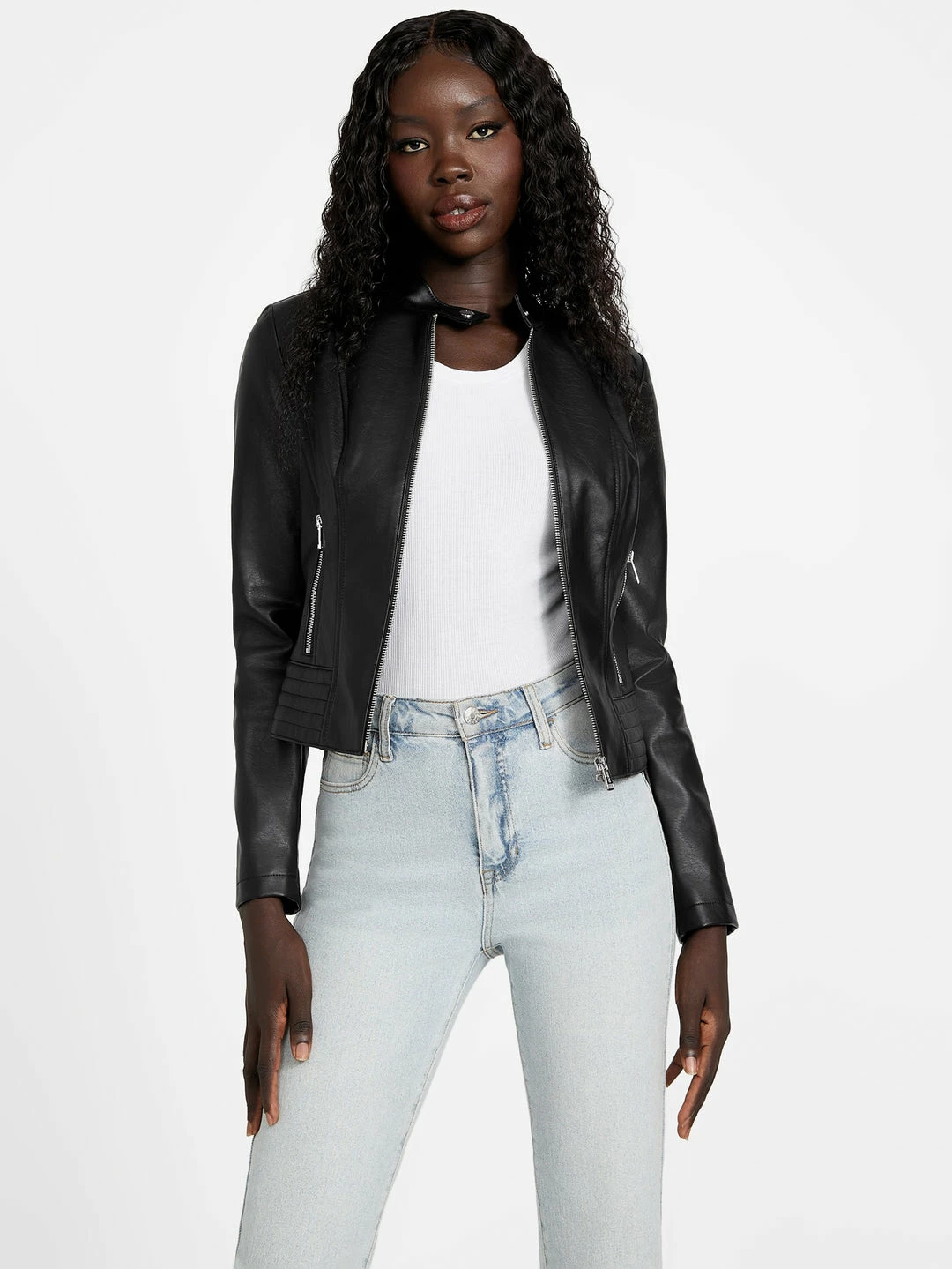Find your edge in this faux-leather jacket. Featuring a moto design, stand collar with snap closure, dual zip pockets and front-zip closure.