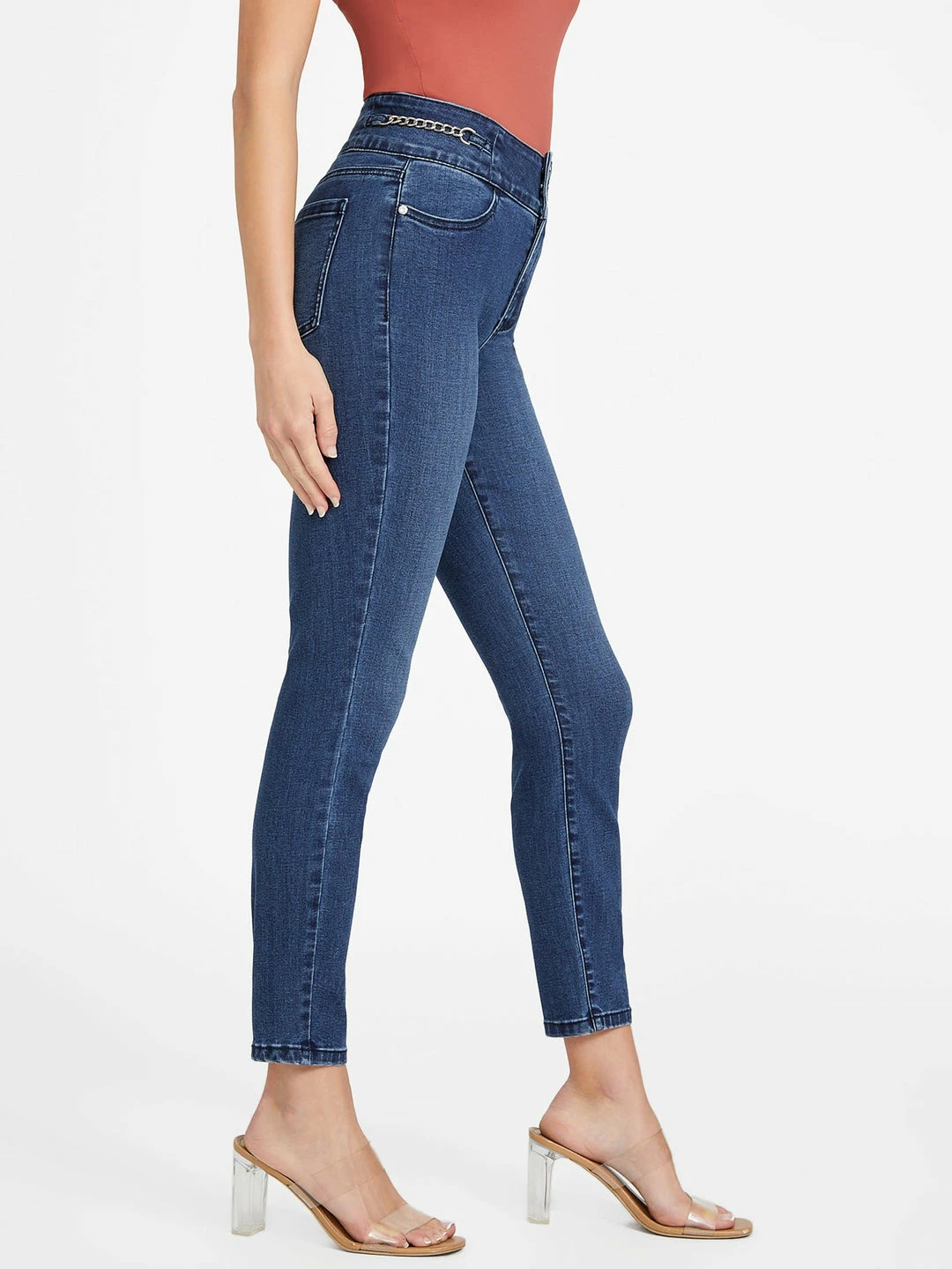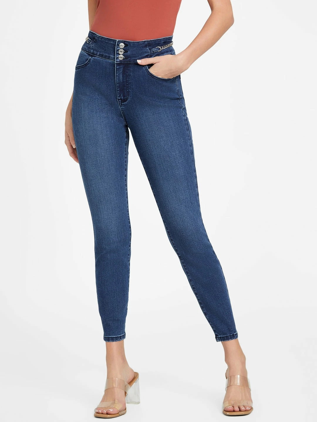 Updated skinny denim jeans with an edge. Designed with a classic skinny silhouette, chain detail at the waist, high waist with three buttons and four-pocket construction.
