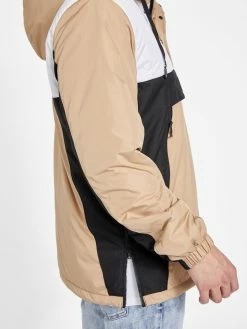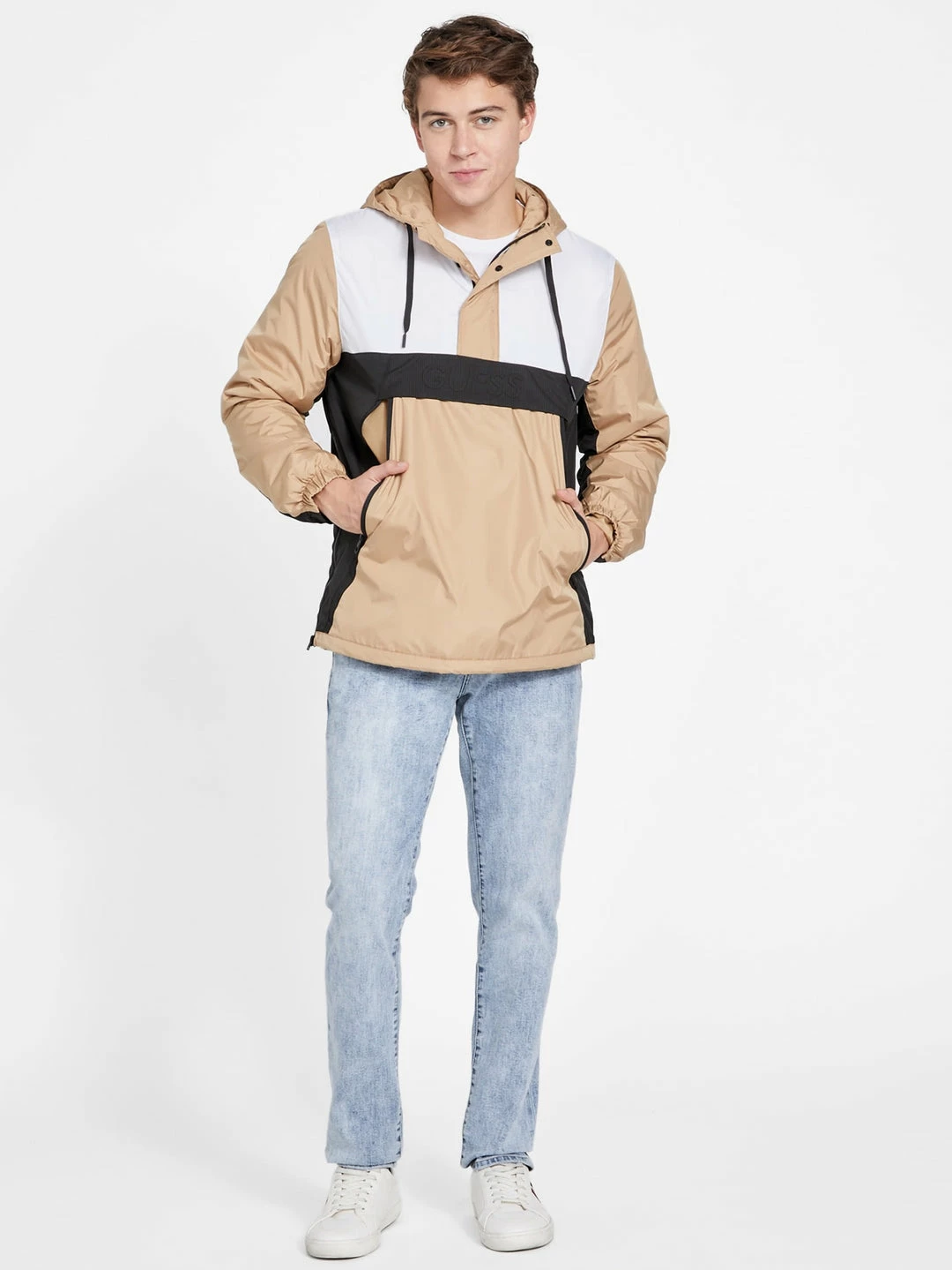 Great for keeping warm. A padded, pullover jacket featuring a color-block design, attached hood, snap-button placket, front zip pockets, embossed logo, long sleeves and elastic cuffs.