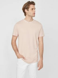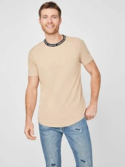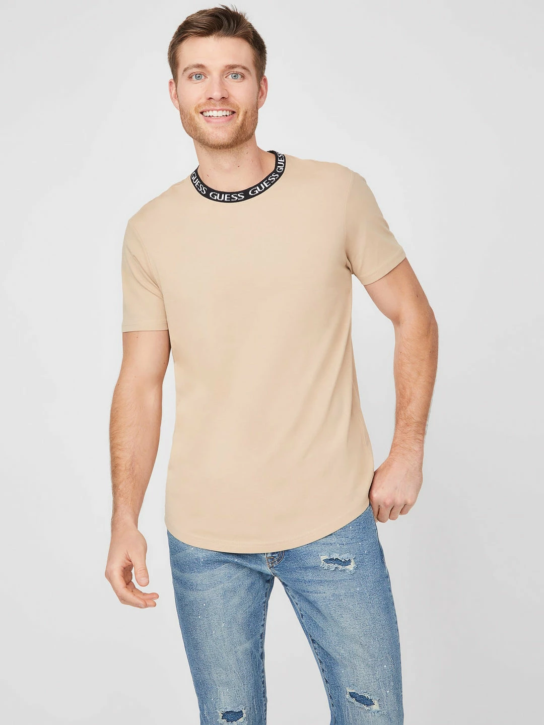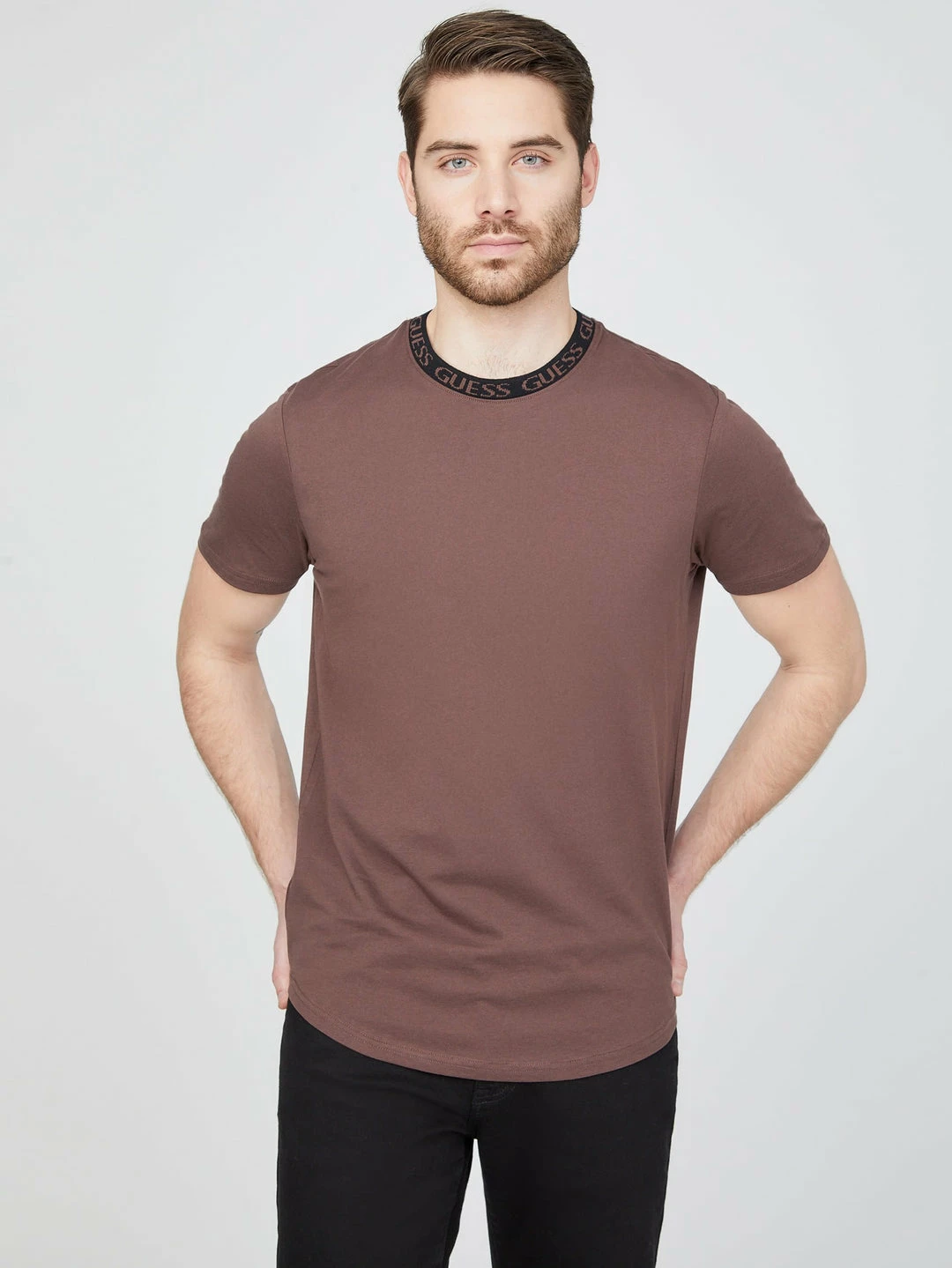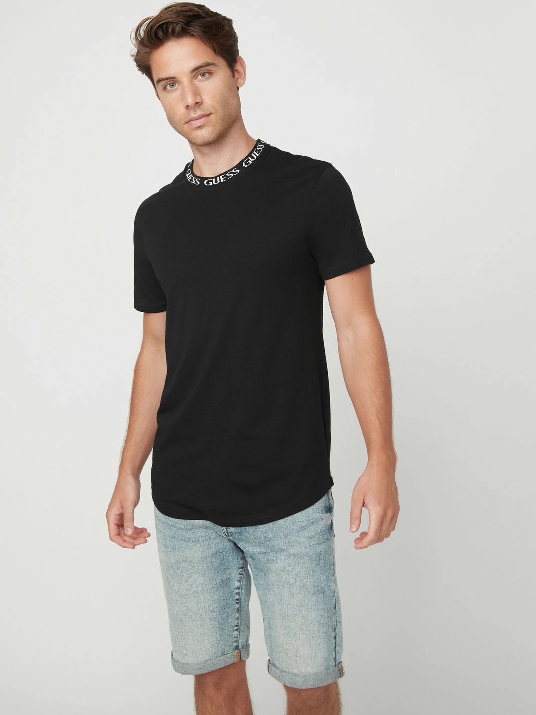 An updated basic, this short-sleeve knit tee is designed with a ribbed repeating logo detail at the crew neckline and a slightly curved hem.