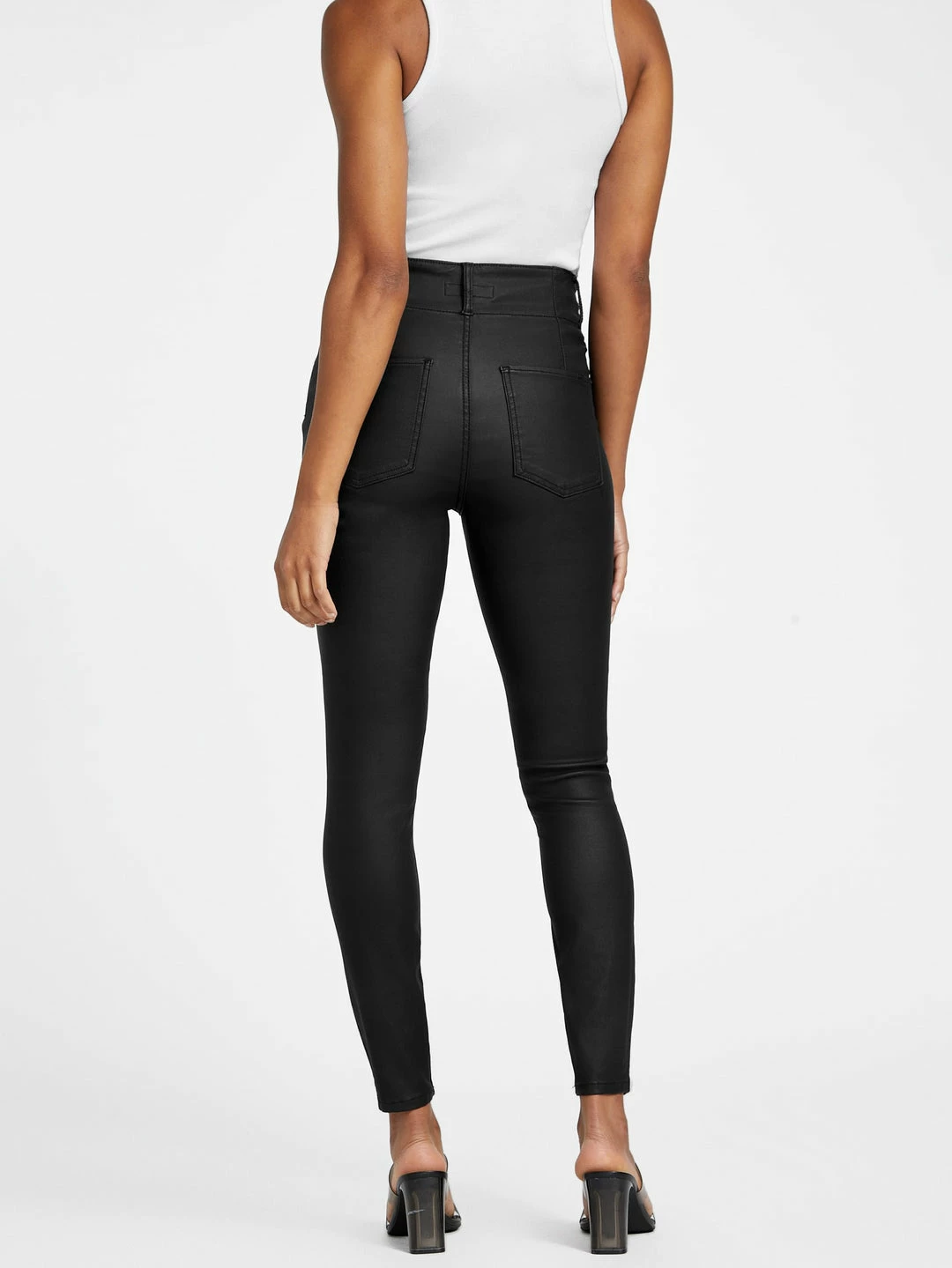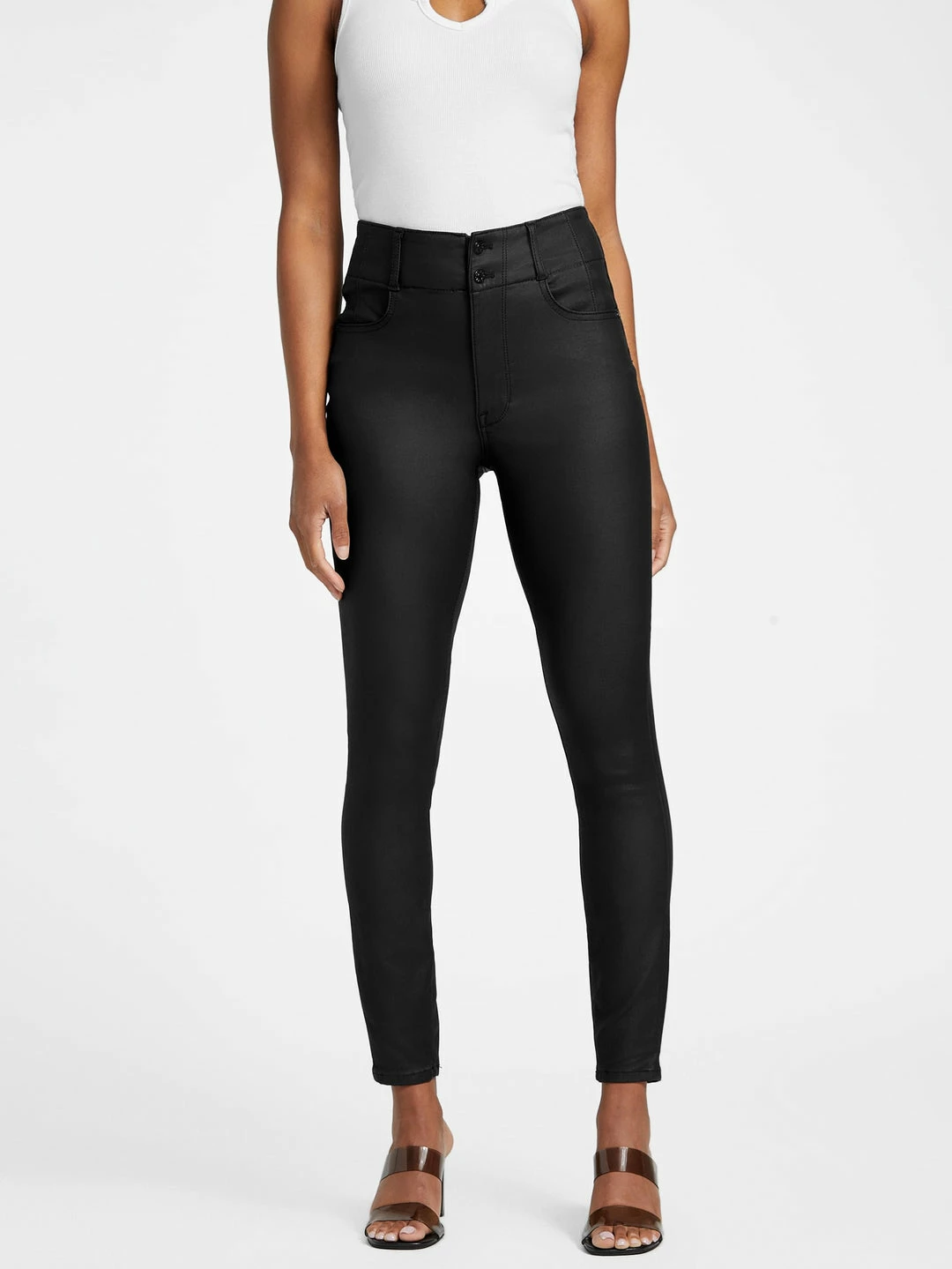Make an impression when you where these jeans designed in a coated stretch fabrication, featuring a skinny leg and corset-styled high waist with dual button closures.