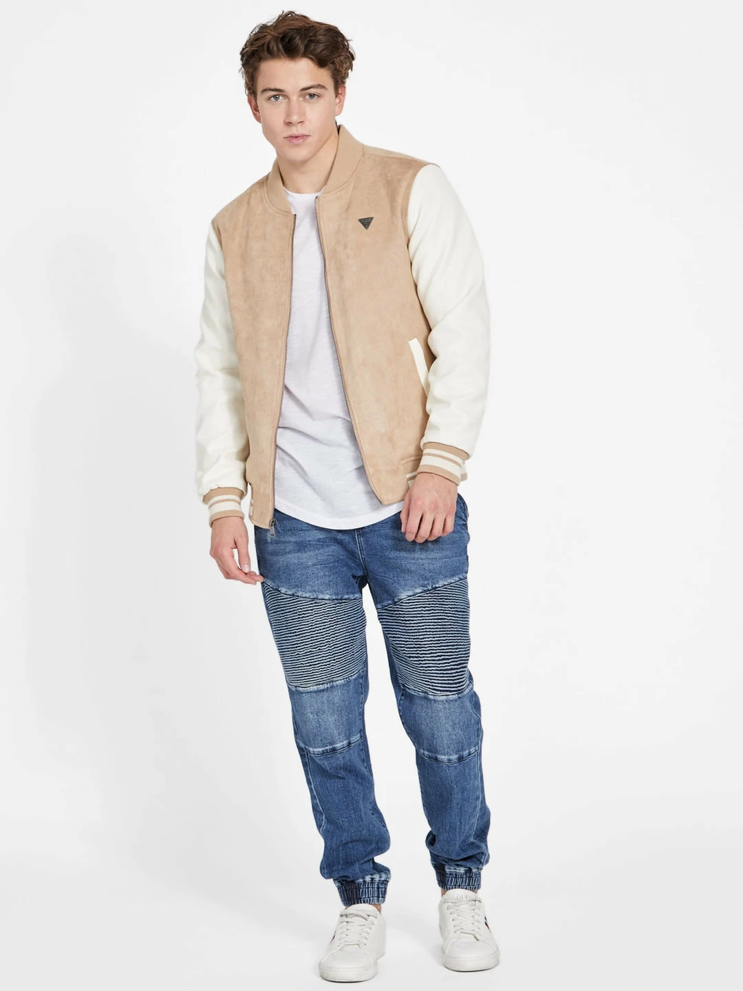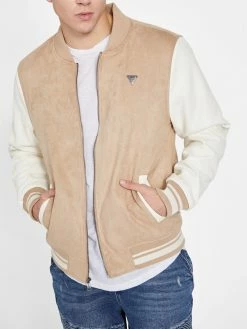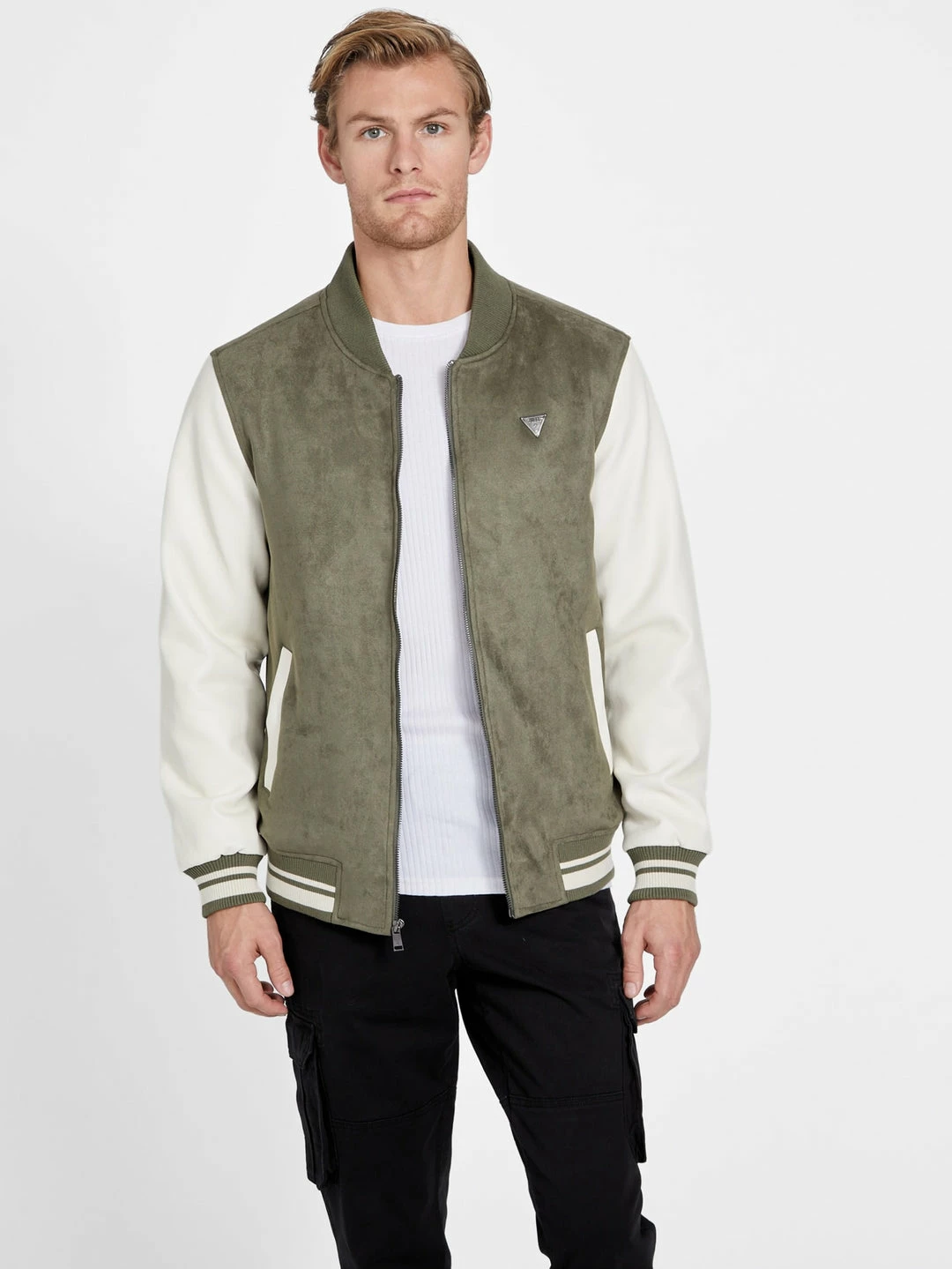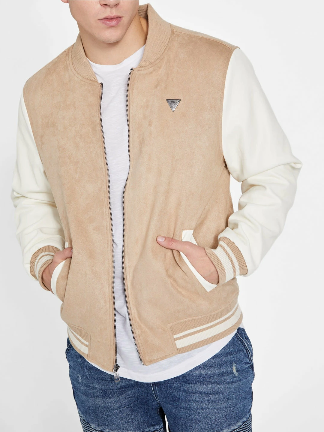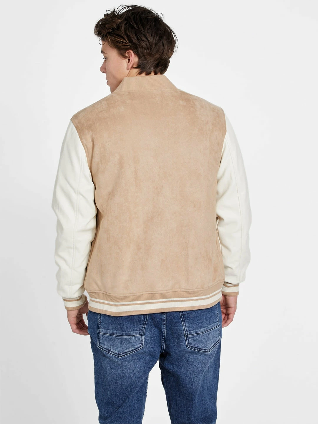 Soft, faux suede covers this varsity jacket featuring contrast long sleeves, front pockets, striped ribbed trim and zip-up closure.