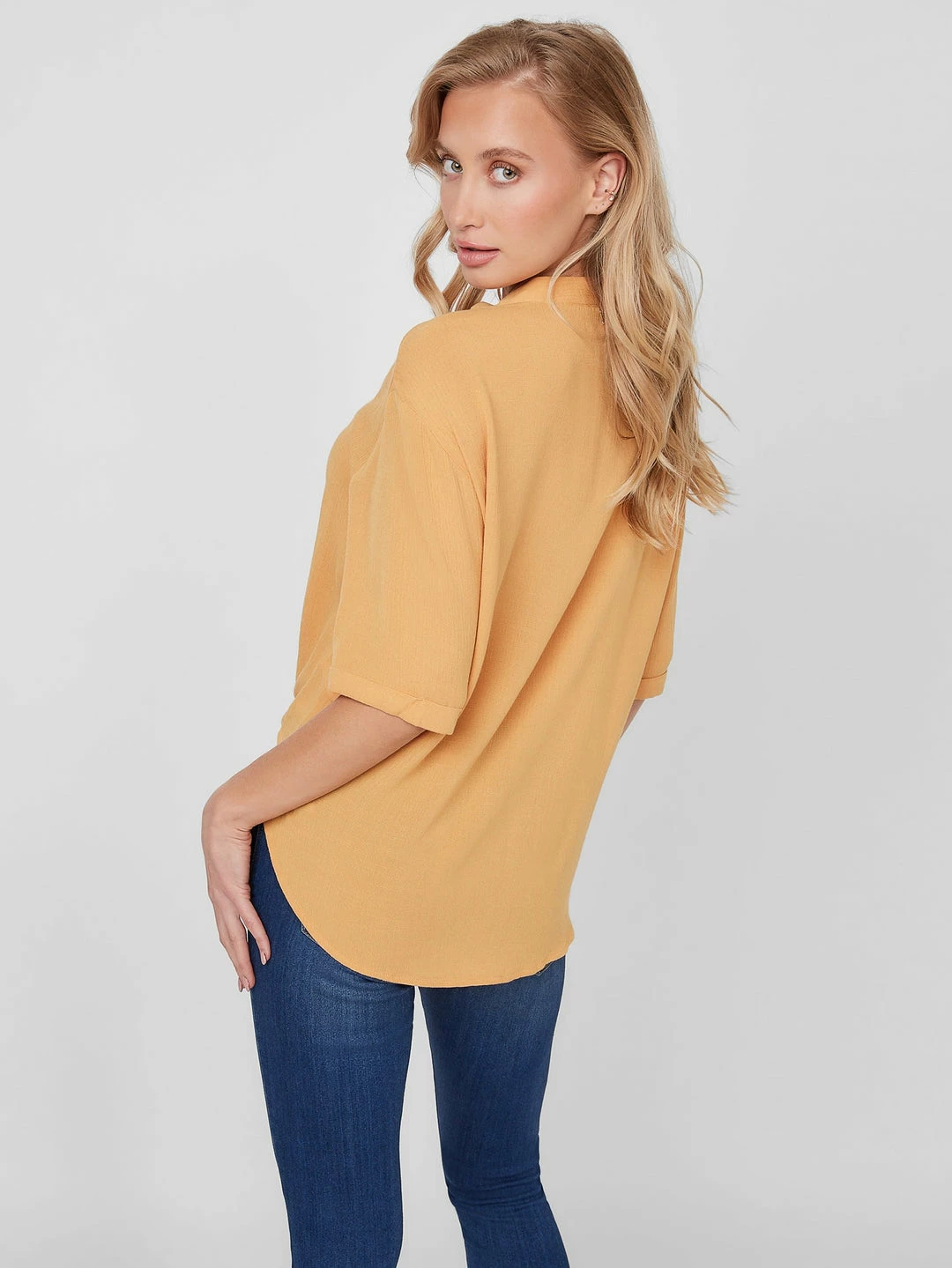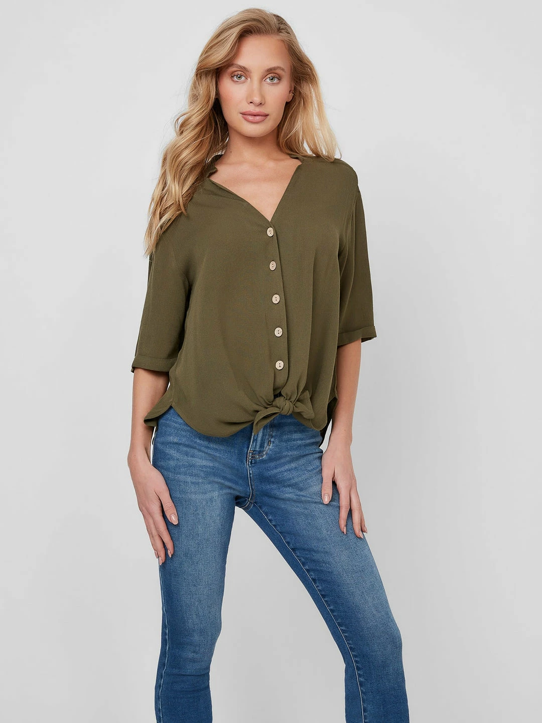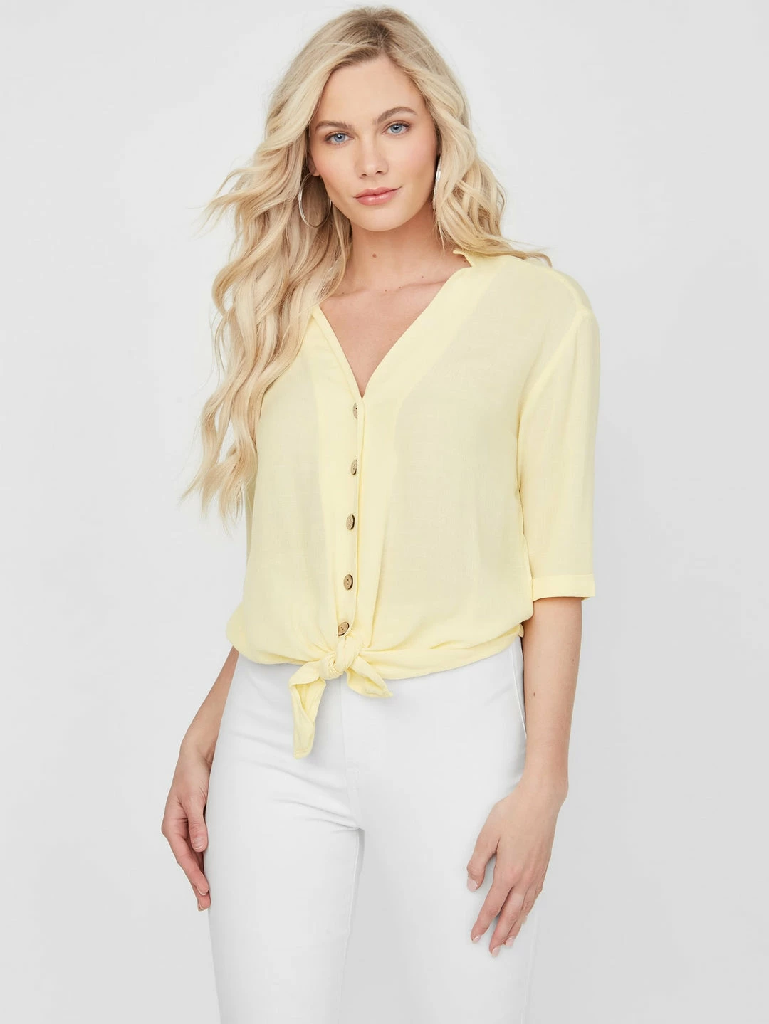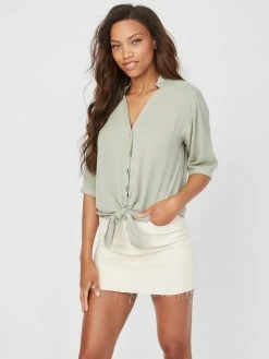 Made in a slightly oversized silhouette, this lightweight top features a V-neckline with stand collar and short sleeves. Finished with wood-styled front button closures and tie security at the hem.
