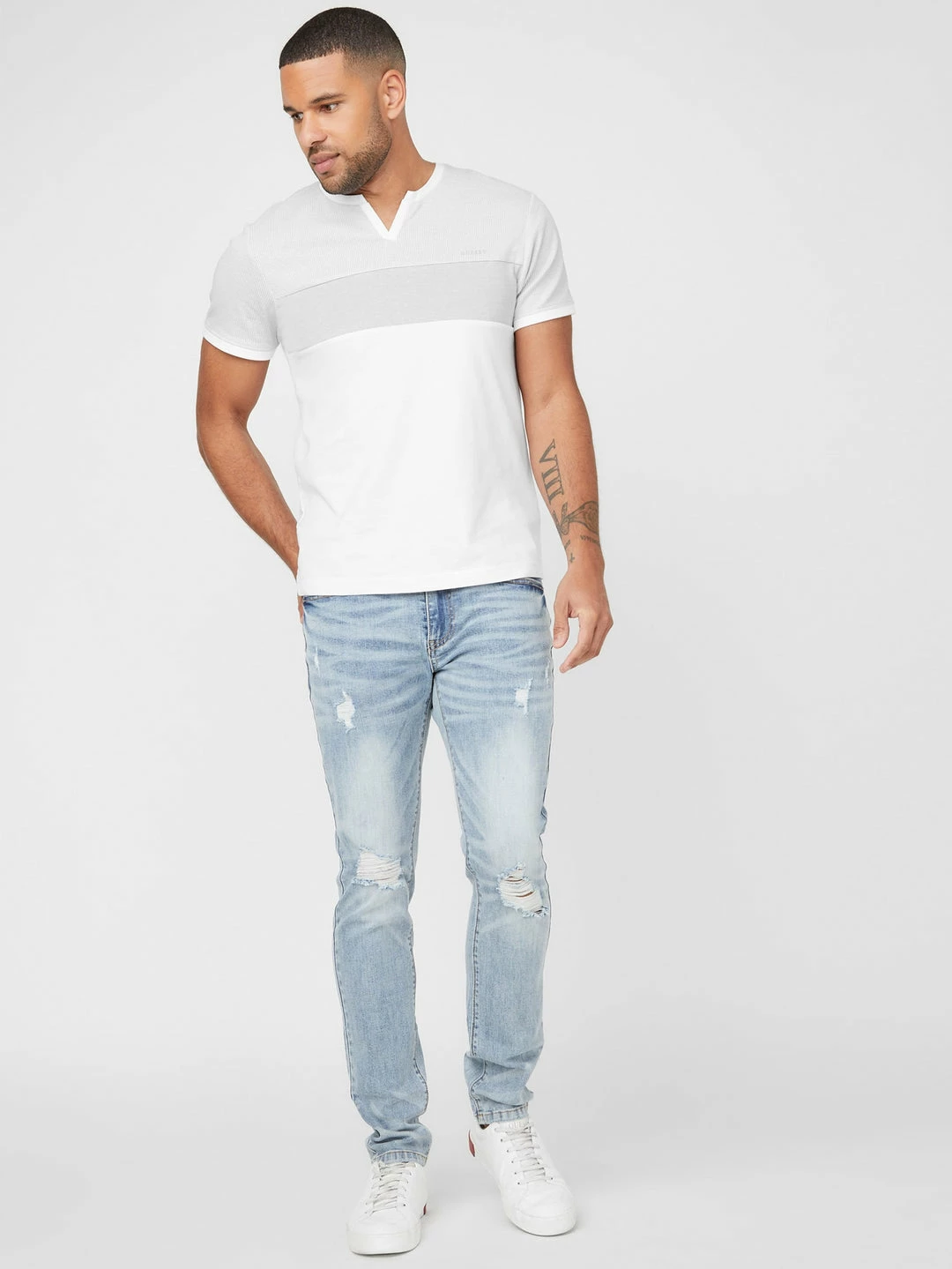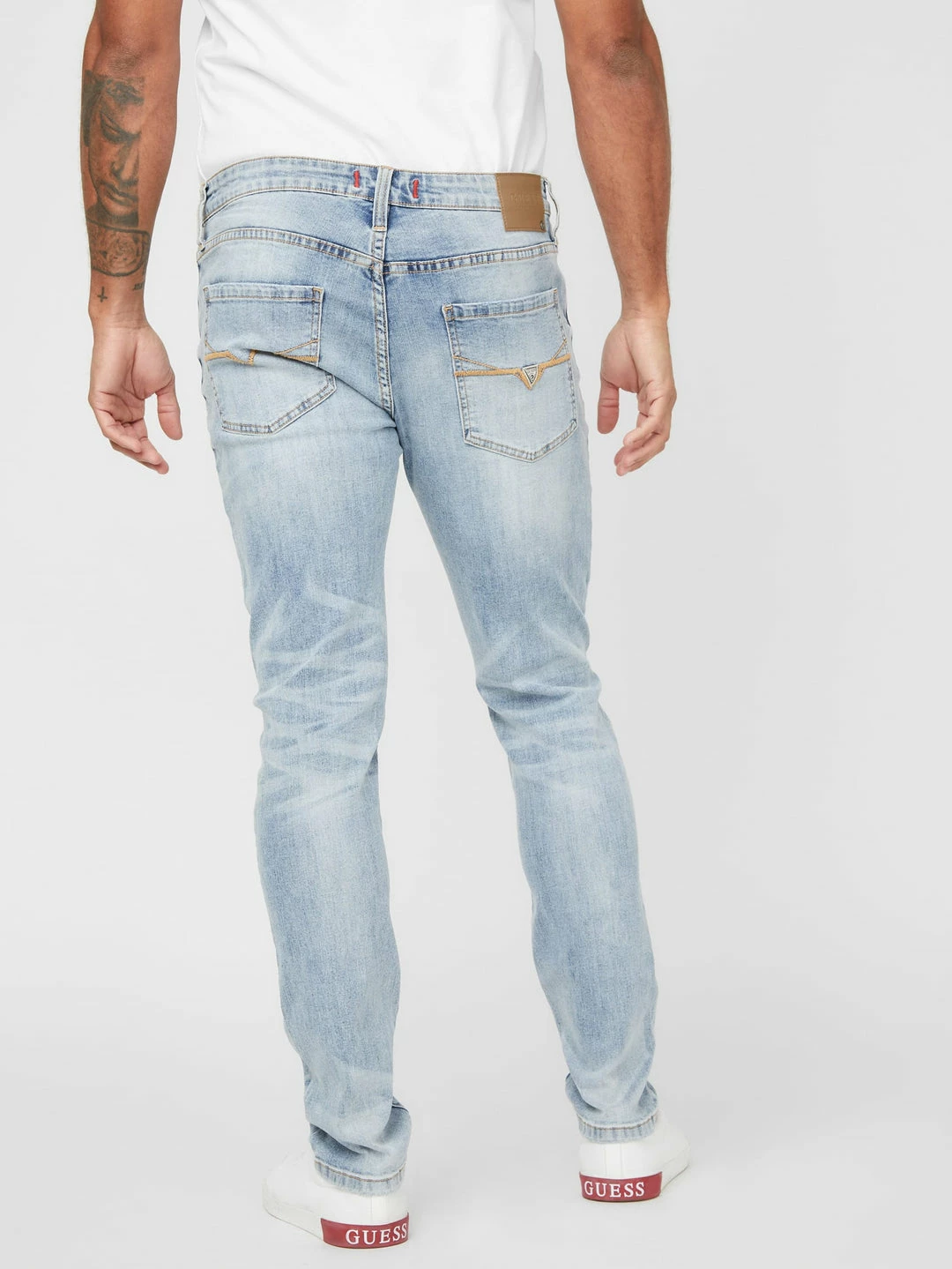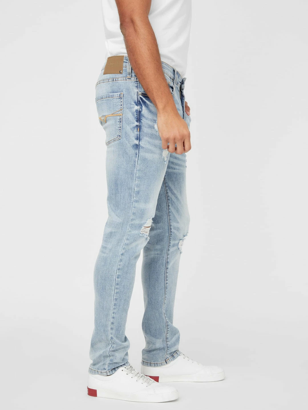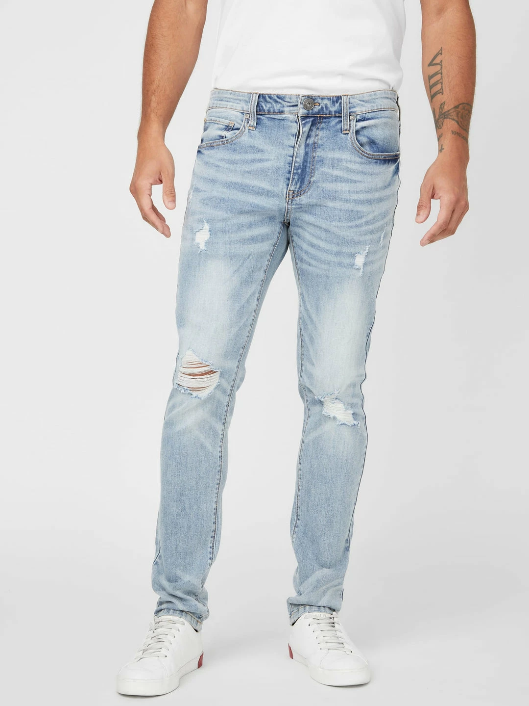 A pair of classic skinny jeans with a slim fit and mid rise, featuring destroyed detailing and fading for a more lived-in look. Constructed with stretch denim for all-day wear.