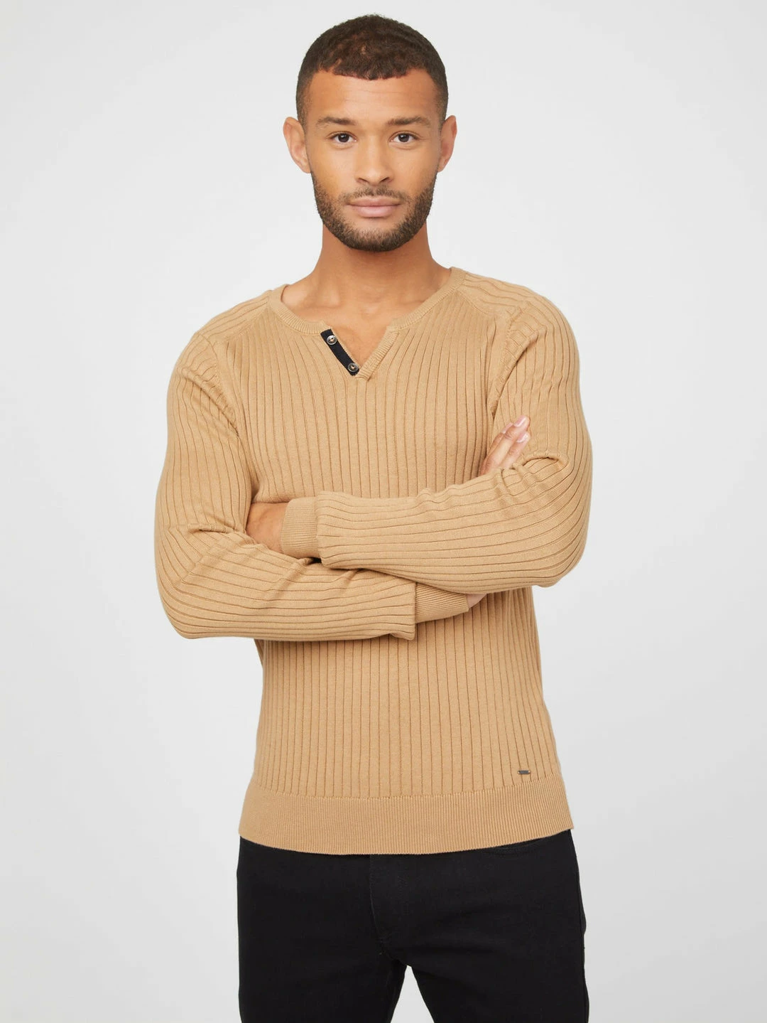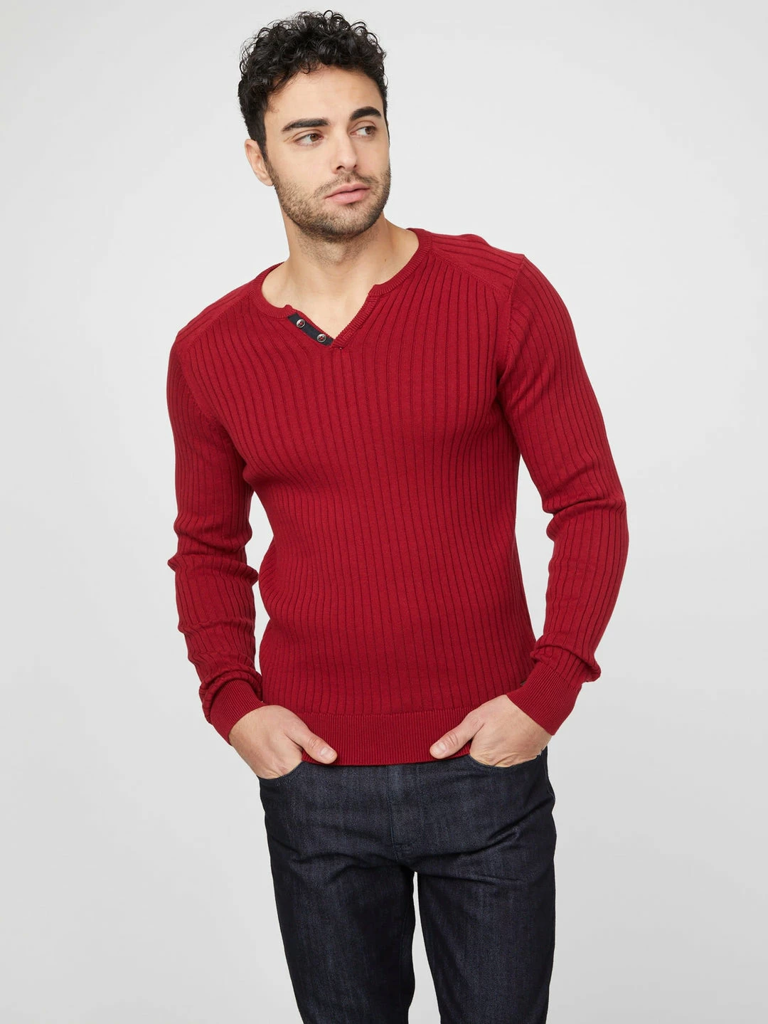 Made in a soft rib-knit fabrication, this long-sleeve sweater tee features a slit at the neckline with button details.