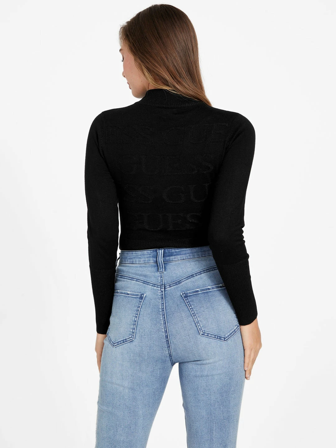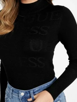 Perfect for everyday wear, this fitted sweater is designed in an allover logo print with a mock neckline and finished with shining lurex accenting throughout.