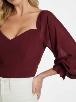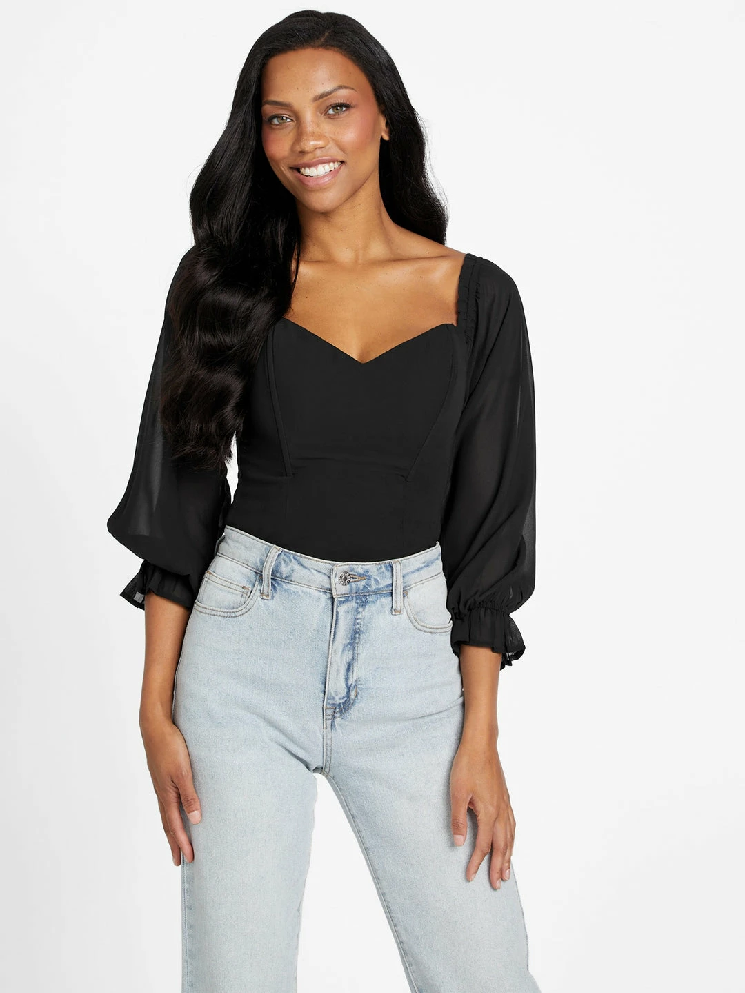 Sheer top designed with a contouring construction, sweetheart neckline, sheer balloon sleeves with ruffled cuffs.