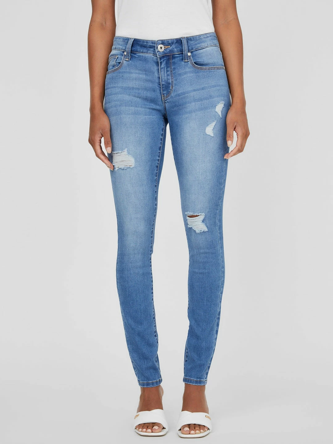 A pair of skinny jeans featuring a classic fit, whiskering, intentional fading and destroyed details for an on-trend look.
