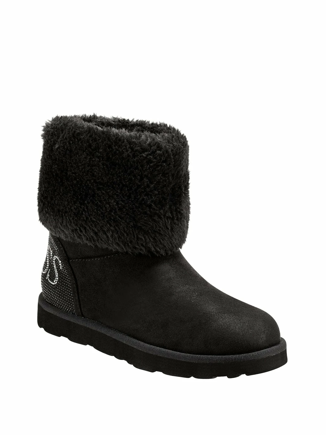 A must-own cold-weather shoe. These faux-suede boots feature a faux-shearling topper and lining, rhinestone logo heel, track soles and a round toe. Pull-on design.