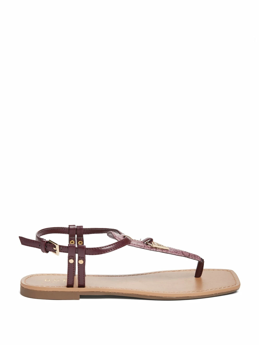 Perfect for a beachside stroll or a weekend trip. These faux-leather sandals feature a T-strap design, gold-tone accents, logo and double straps at the sides.