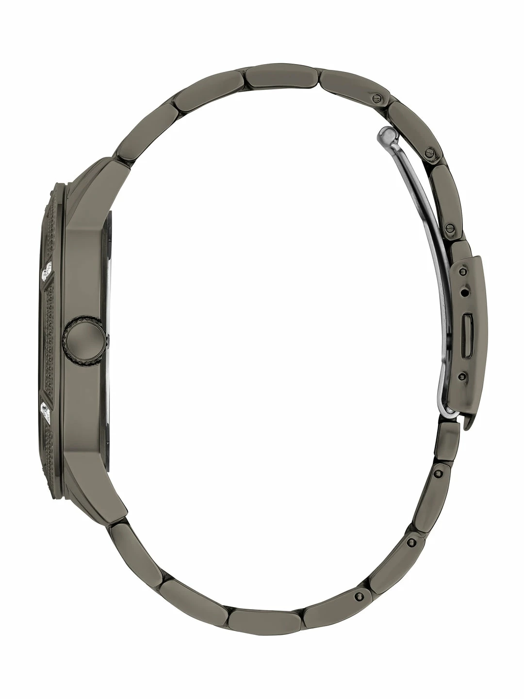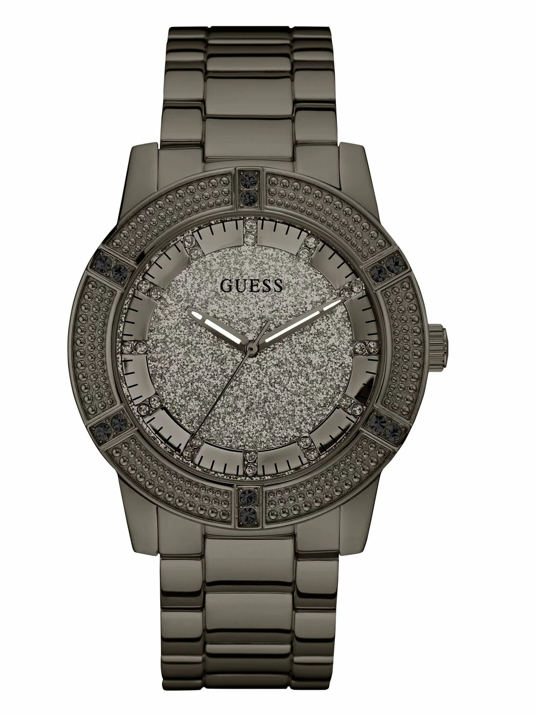 With a sleek gunmetal look, this timepiece is a versatile everyday statement to wear for work or play. Featuring a chain bracelet and a studded bezel.