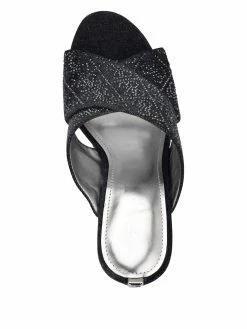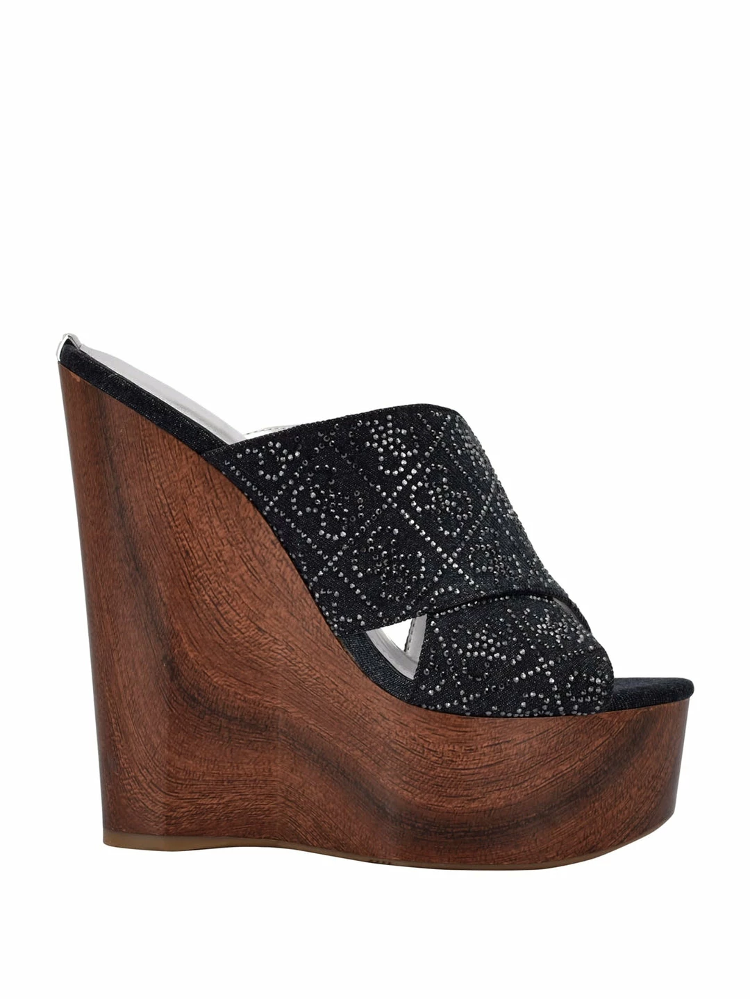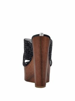 Add a touch of shine to your look with these open-toe wedges featuring a crisscross vamp design with rhinestone logo pattern and refined wooden platform.