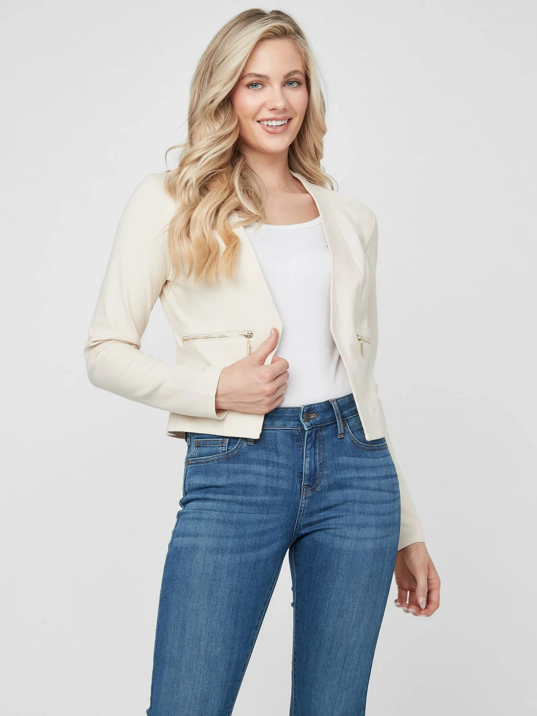 Look chic from work to play in this tailored blazer featuring an open front construction and front seam pockets.
