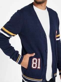 With a vintage varsity-inspired design, this cardigan features a V-neckline, vertical striped design, dual side pockets, ribbed trim, triangle logo and front button closure. Made with cotton fiber.